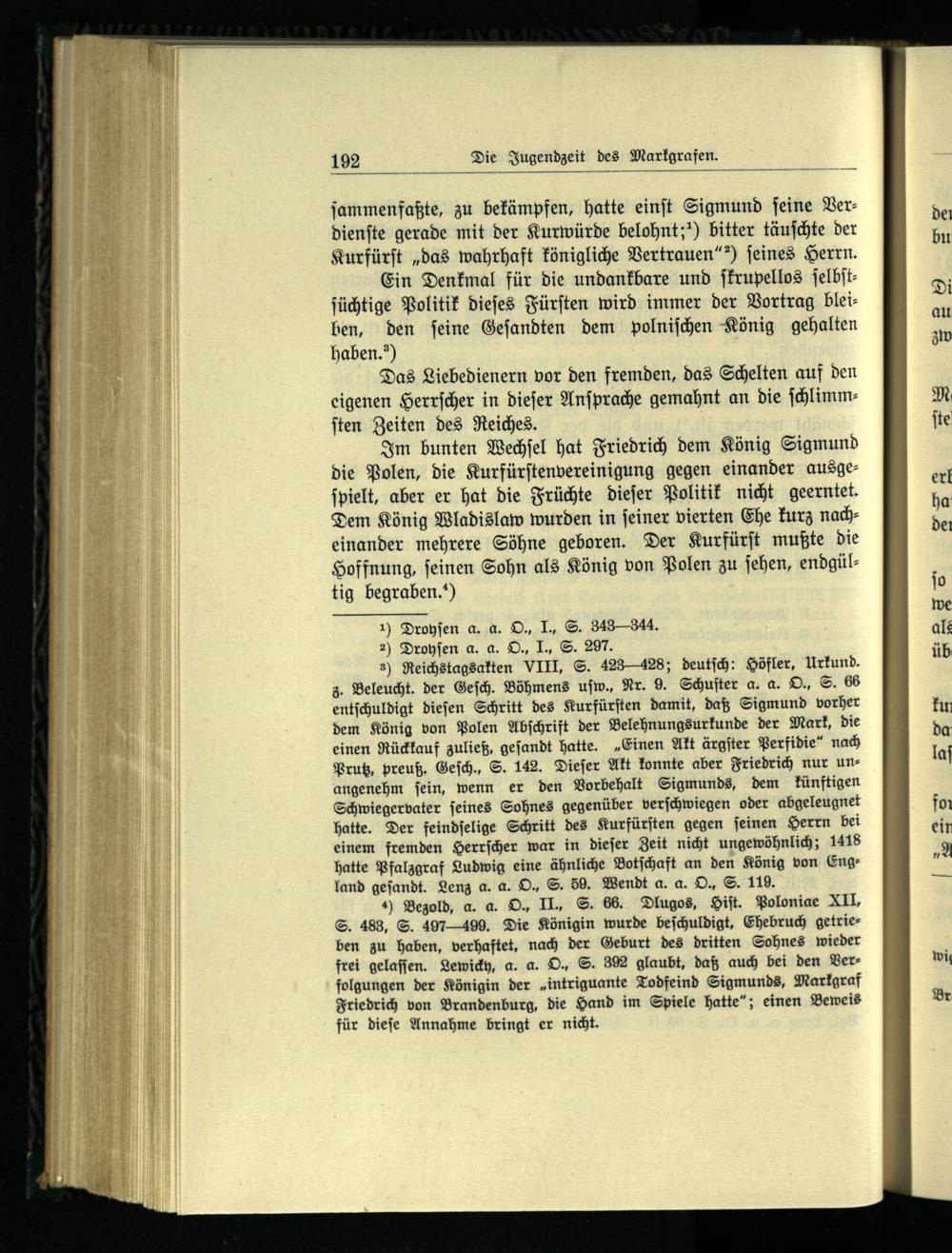 8) Reichstagsakten VIII, S. 423428; deutſch : Höfler, Urkund . z. Beleucht. der Geſch. Böhmens uſw., Nr. 9. Schuſter a. a. O., S. 66 entſchuldigt dieſen Schritt des Kurfürſten damit, daß Sigmund vorher dem König von Polen Abſchrift der Belehnungsurkunde der Mark, die einen Rückkauf zuließ, geſandt hatte.„Einen Akt ärgſter Perfidie“ nach Prutz , preuß. Geſch., S. 142. Dieſer Akt konnte aber Friedrich nur unangenehm ſein, wenn er den Vorbehalt Sigmunds, dem künftigen Schwiegervater ſeines Sohnes gegenüber verſchwiegen oder abgeleugnet hatte. Der feindſelige Schritt des Kurfürſten gegen ſeinen Herrn bei einem fremden Herrſcher war in dieſer Zeit nicht ungewöhnlich; 1418 hatte Pfalzgraf Ludwig eine ähnliche Botſchaft an den König von England geſandt. Lenz a. a. O., S. 59. Wendt a. a. O., S. 119.