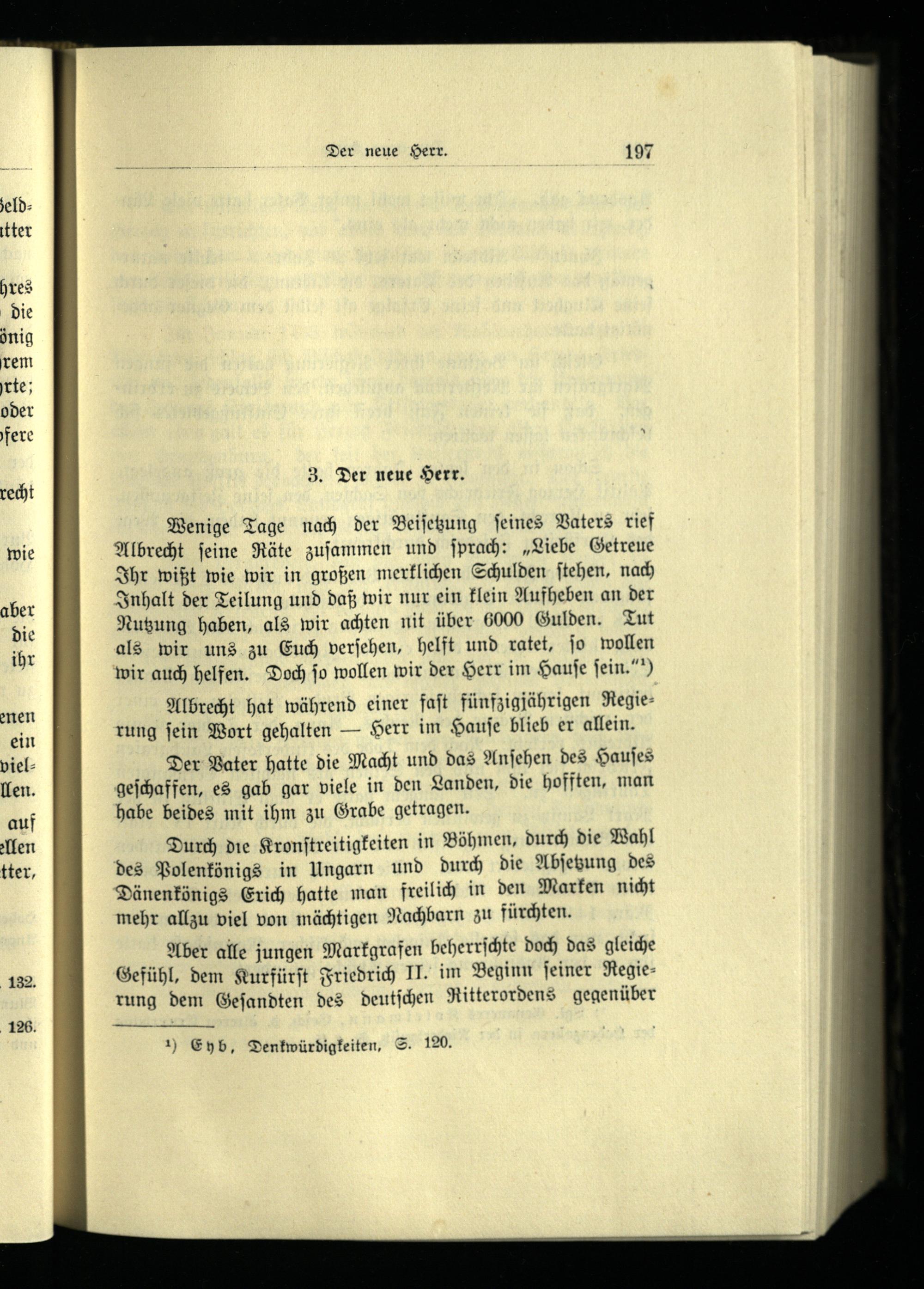 Wenige Tage nach der Beiſetzung ſeines Vaters rief Albrecht ſeine Räte zuſammen und ſprach:„Liebe Getreue Ihr wißt wie wir in großen merklichen Schulden ſtehen, nach Inhalt der Teilung und daß wir nur ein klein Aufheben an der Nutzung haben, als wir achten nit über 6000 Gulden. Tut als wir uns zu Euch verſehen, helft und ratet, ſo wollen wir auch helfen. Doch ſo wollen wir der Herr im Haufe ſein.“)
