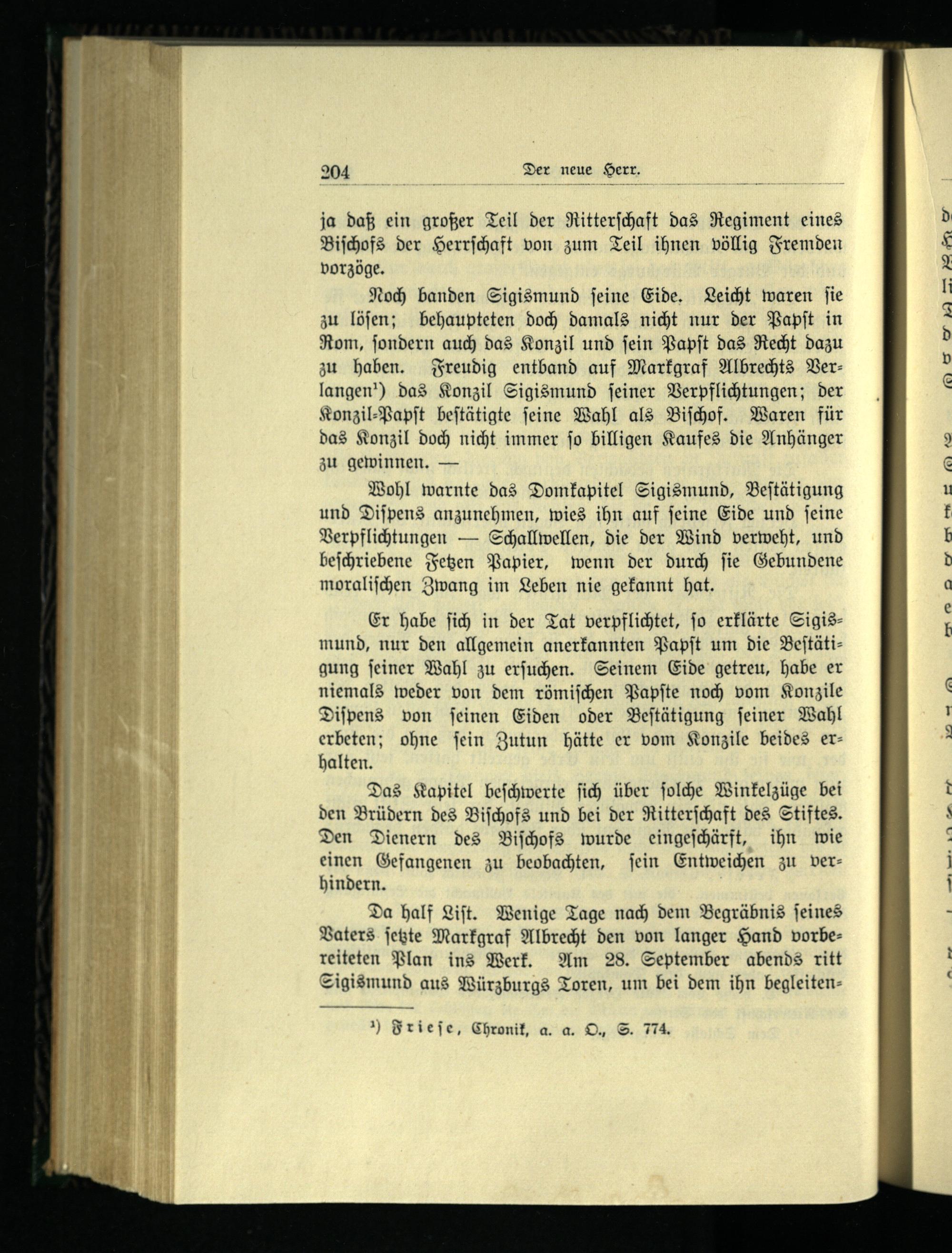 Noch banden Sigismund ſeine Eide. Leicht waren fie zu löſen; behaupteten doch damals nicht nur der Papſt in Rom, ſondern auch das Konzil und ſein Papſt das Recht dazu zu haben. Freudig entband auf Markgraf Albrechts Verlangen!) das Konzil Sigismund ſeiner Verpflichtungen; der Konzil⸗Papſt beſtätigte ſeine Wahl als Biſchof. Waren für das Konzil doch nicht immer ſo billigen Kaufes die Anhänger zu gewinnen.—