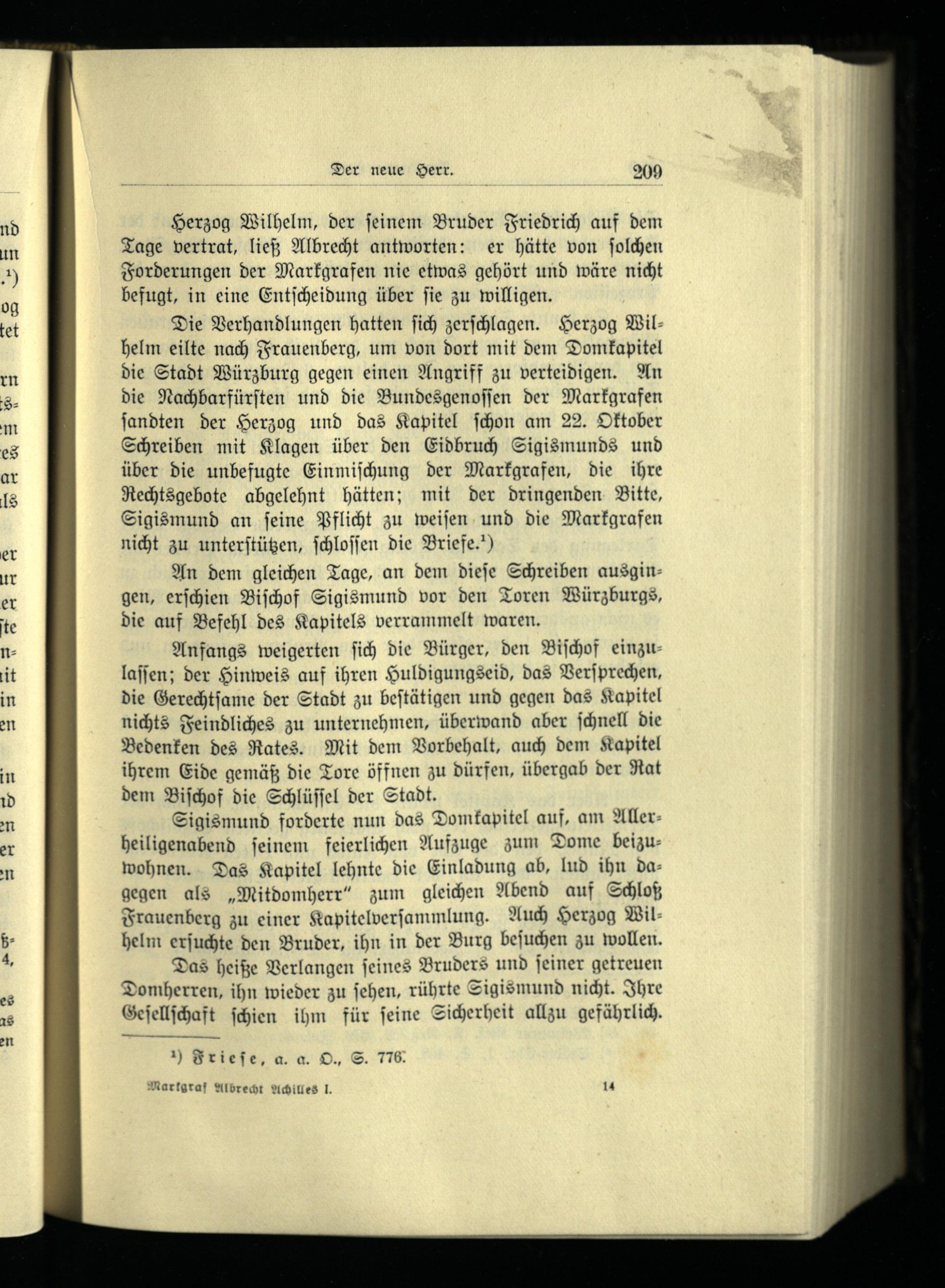 Die Verhandlungen hatten ſich zerſchlagen. Herzog Wil— helm eilte nach Frauenberg, um von dort mit dem Domkapitel die Stadt Würzburg gegen einen Angriff zu verteidigen. An die Nachbarfürſten und die Bundesgenoſſen der Markgrafen ſandten der Herzog und das Kapitel ſchon am 22. Oktober Schreiben mit Klagen über den Eidbruch Sigismunds und über die unbefugte Einmiſchung der Markgrafen, die ihre Rechtsgebote abgelehnt hätten; mit der dringenden Bitte, Sigismund an ſeine Pflicht zu weiſen und die Markgrafen nicht zu unterſtützen, ſchloſſen die Briefe.“)
