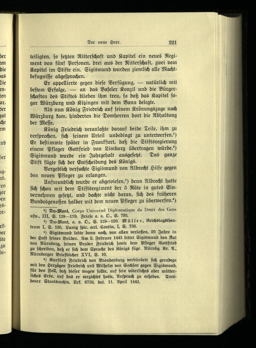 König Friedrich veranlaßte darauf beide Teile, ihm zu verſprechen, ſich ſeinem Urteil unbedingt zu unterwerfen.“) Er beſtimmte ſpäter in Frankfurt , daß die Stiftsregierung einem Pfleger Gottfried von Limburg übertragen würde.“) Sigismund wurde ein Jahrgehalt ausgeſetzt. Das ganze Stift fügte ſich der Entſcheidung des Königs.