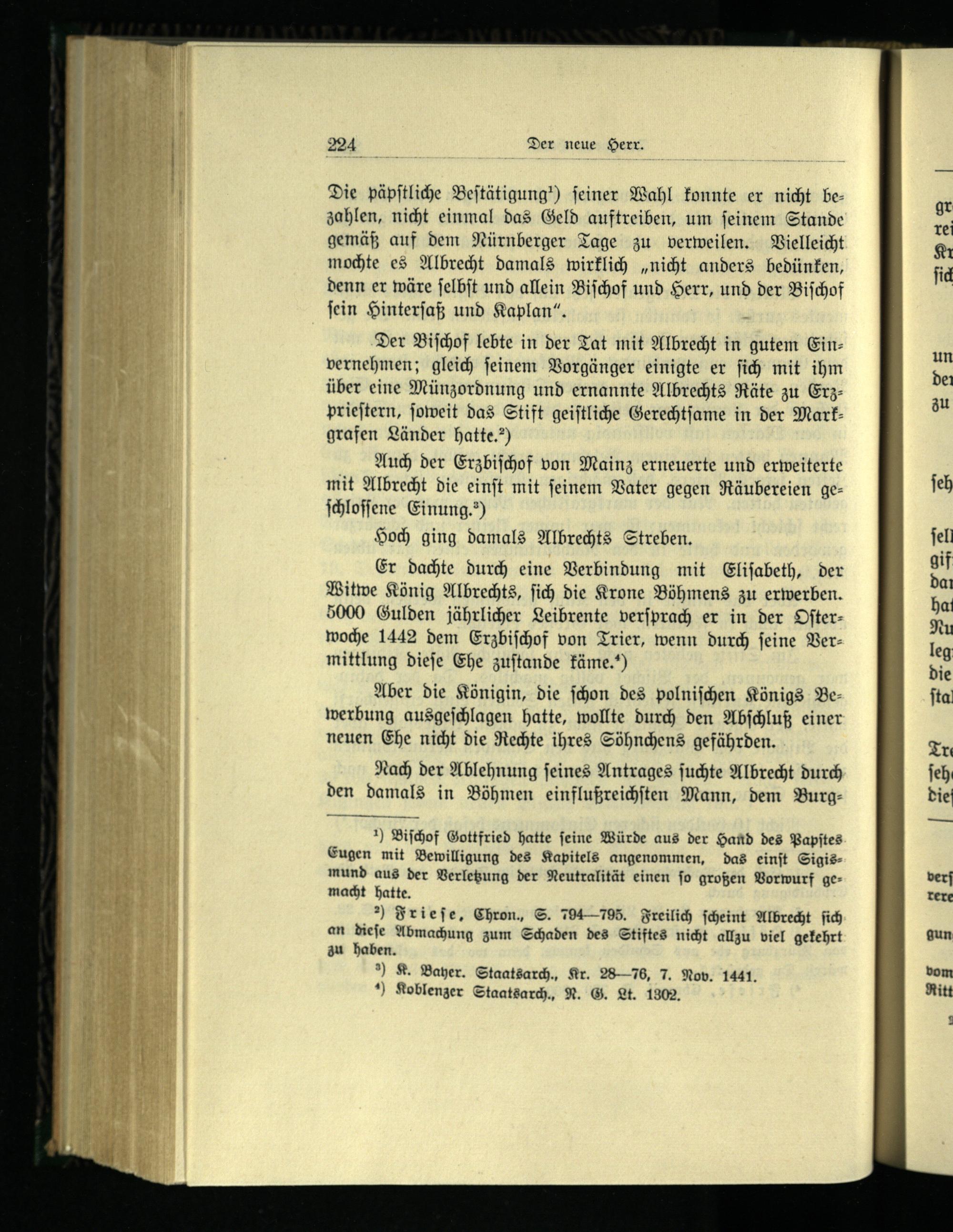 Der Biſchof lebte in der Tat mit Albrecht in gutem Einvernehmen; gleich ſeinem Vorgänger einigte er ſich mit ihm über eine Münzordnung und ernannte Albrechts Räte zu Erz— prieſtern, ſoweit das Stift geiſtliche Gerechtſame in der Mark— grafen Länder hatte.“)