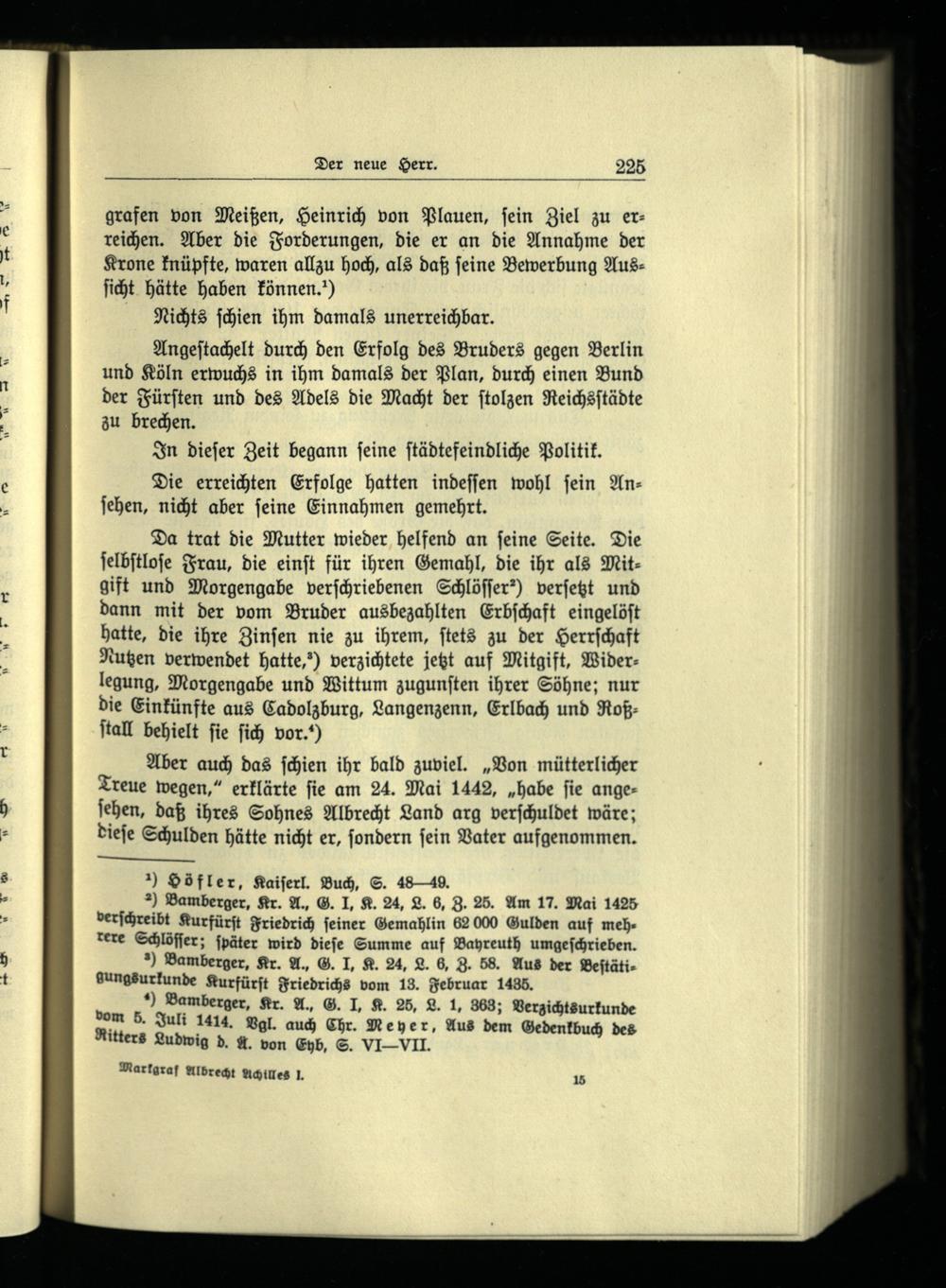 Da trat die Mutter wieder helfend an ſeine Seite. Die ſelbſtloſe Frau, die einſt für ihren Gemahl, die ihr als Mitgift und Morgengabe verſchriebenen Schlöffer?) verſetzt und dann mit der vom Bruder ausbezahlten Erbſchaft eingelöſt hatte, die ihre Zinſen nie zu ihrem, ſtets zu der Herrſchaft Nutzen verwendet hatte,) verzichtete jetzt auf Mitgift, Widerlegung, Morgengabe und Wittum zugunſten ihrer Söhne; nur die Einkünfte aus Cadolzburg , Langenzenn , Erlbach und Roßſtall behielt fie ſich vor.“
