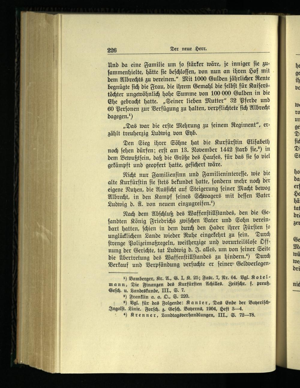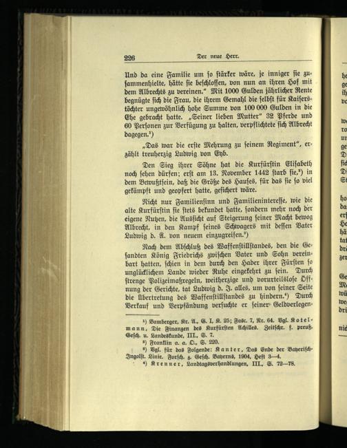 Nicht nur Familienſinn und Familienintereſſe, wie die alte Kurfürſtin ſie ſtets bekundet hatte, ſondern mehr noch der eigene Nutzen, die Ausſicht auf Steigerung ſeiner Macht bewog Albrecht, in den Kampf ſeines Schwagers mit deſſen Vater Ludwig d. A. von neuem einzugreifen.“)