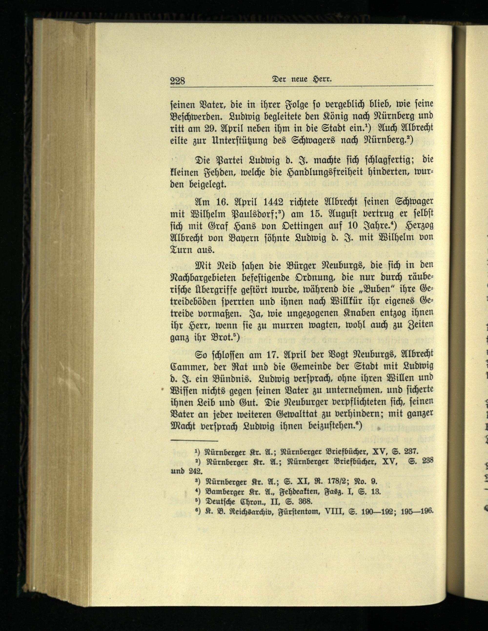So ſchloſſen am 17. April der Vogt Neuburgs, Albrecht Cammer, der Rat und die Gemeinde der Stadt mit Ludwig d. J. ein Bündnis. Ludwig verſprach, ohne ihren Willen und Wiſſen nichts gegen feinen Vater zu unternehmen, und ſicherte ihnen Leib und Gut. Die Neuburger verpflichteten ſich, ſeinen Vater an jeder weiteren Gewalttat zu verhindern; mit ganzer Macht verſprach Ludwig ihnen beizuſtehen.“