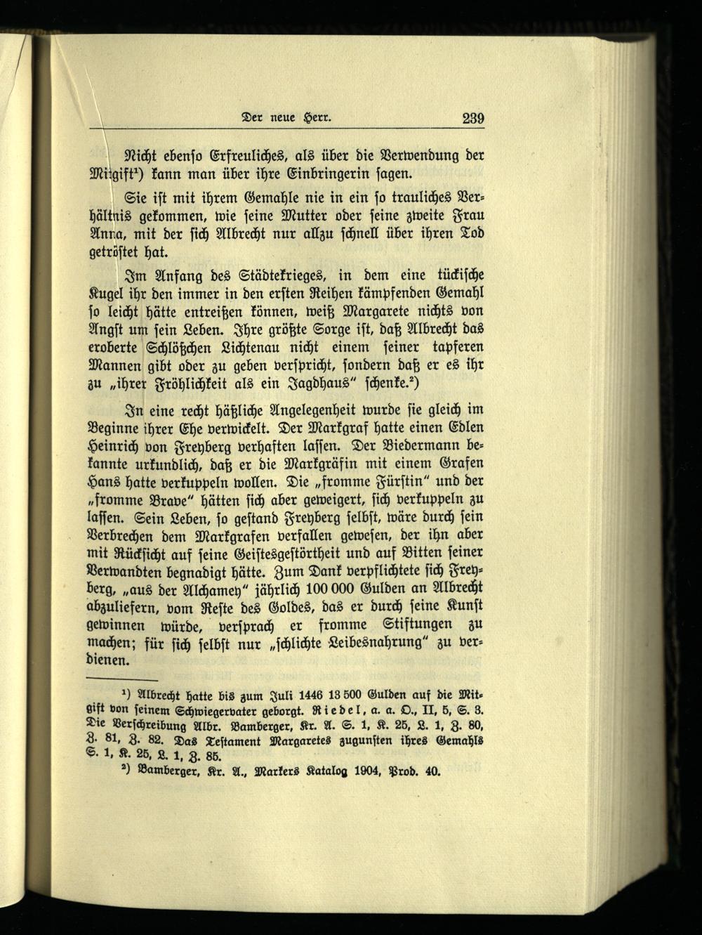 ) Albrecht hatte bis zum Juli 1446 13 500 Gulden auf die Mitgift von feinem Schwiegervater geborgt. Riedel, a. a. O., II. 5, S. 3, Die Verſchreibung Albr. Bamberger, Kr. A. S. 1, K. 25, L. 1, Z. 80, 8. 81, 3. 82. Das Teſtament Margaretes zugunſten ihres Gemahls S. 1, K. 25, L. 1, 3. 85.