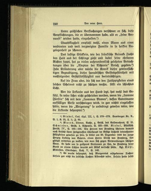 2) Murrs, Literar. Nachr. z. Geſch. des Goldmachens, S. 21. Schmieder, Geſch. d. Alchemie, S. 225—226. Riedel, Märkiſch. Forſch. IV., S. 163164. Die Herren von Freyberg ſcheinen damals nach Anſicht ihrer Zeitgenoſſen überhaupt im Beſitze äußerſt intereſſanter Fähigkeiten geweſen zu ſein, ſo bittet am 20. Dezember 1444 der junge Herzog Ludwig von Bayern, einen Herrn Ulrich von Freyberg, ihm gütigſt mitteilen zu wollen, wie man ſich gegen Verwundungen ſchützen könne. Er habe um ſo größeres Vertrauen zu ihm, da Freyberg ſeine Kunſt an einem Ochſen bereits mit Glück verſucht hätte. Vgl. Bühl, Miscellen, Oberbayer. Arch. V, S. 142.