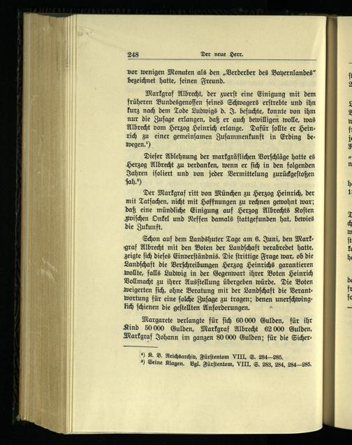 Schon auf dem Landshuter Tage am 6. Juni, den Markgraf Albrecht mit den Boten der Landſchaft verabredet hatte, zeigte ſich dieſes Einverſtändnis. Die ſtrittige Frage war, ob die Landſchaft die Verſchreibungen Herzog Heinrichs garantieren wollte, falls Ludwig in der Gegenwart ihrer Boten Heinrich Vollmacht zu ihrer Ausſtellung übergeben würde. Die Boten weigerten ſich, ohne Beratung mit der Landſchaft die Verantwortung für eine ſolche Zuſage zu tragen; denen unerſchwinglich ſchienen die geſtellten Anforderungen.