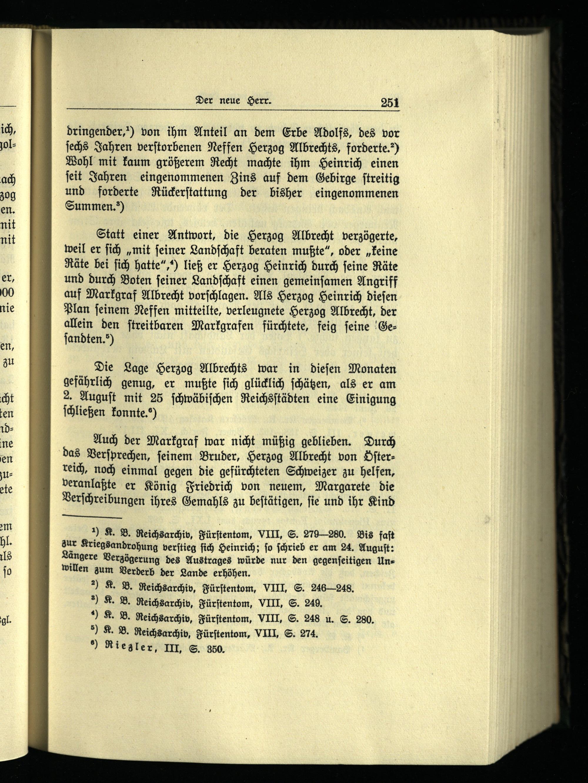 ) K. B. Reichsarchiv, Fürſtentom, VIII, S. 279280. Bis faſt aur Kriegsandrohung verſtieg ſich Heinrich; ſo ſchrieb er am 24. Auguſt: Längere Verzögerung des Austrages würde nur den gegenſeitigen Unwillen zum Verderb der Lande erhöhen.