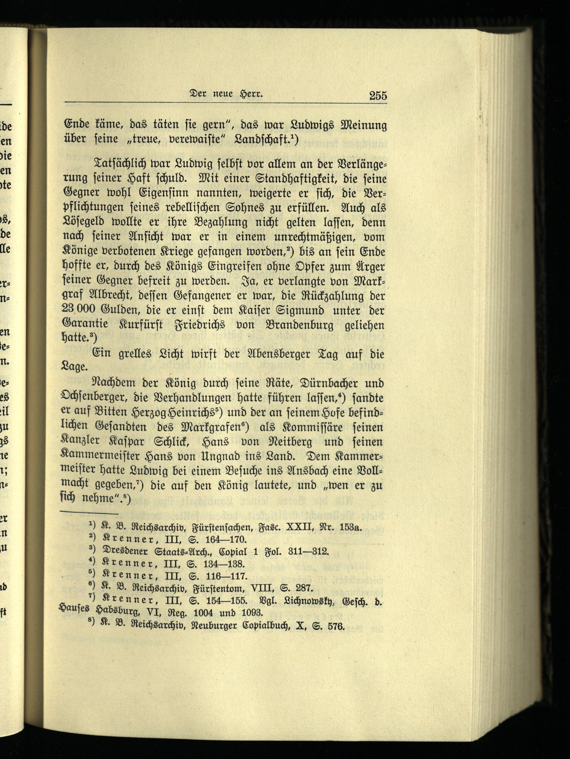 Tatſächlich war Ludwig ſelbſt vor allem an der Verlängerung ſeiner Haft ſchuld. Mit einer Standhaftigkeit, die ſeine Gegner wohl Eigenſinn nannten, weigerte er ſich, die Verpflichtungen ſeines rebelliſchen Sohnes zu erfüllen. Auch als Löſegeld wollte er ihre Bezahlung nicht gelten laſſen, denn nach ſeiner Anſicht war er in einem unrechtmäßigen, vom Könige verbotenen Kriege gefangen worden, bis an fein Ende hoffte er, durch des Königs Eingreifen ohne Opfer zum Arger ſeiner Gegner befreit zu werden. Ja, er verlangte von Markgraf Albrecht, deſſen Gefangener er war, die Rückzahlung der 23 000 Gulden, die er einſt dem Kaiſer Sigmund unter der Garantie Kurfürſt Friedrichs von Brandenburg geliehen hatte.“);