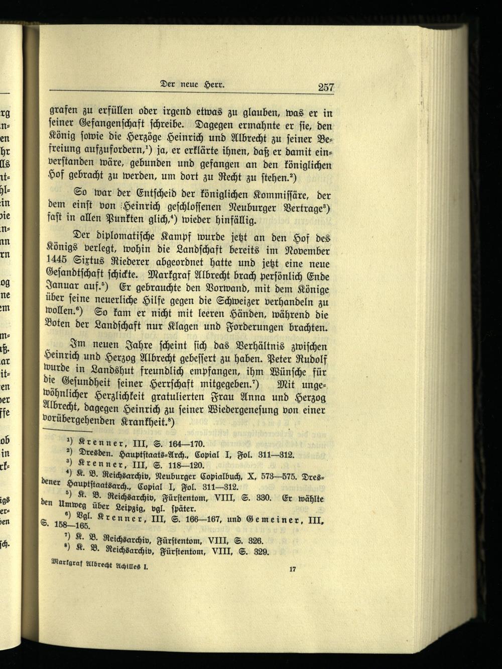 Der diplomatiſche Kampf wurde jetzt an den Hof des Königs verlegt, wohin die Landſchaft bereits im November 1445 Sixtus Riederer abgeordnet hatte und jetzt eine neue Geſandtſchaft ſchickte. Markgraf Albrecht brach perſönlich Ende Januar auf.) Er gebrauchte den Vorwand, mit dem Könige über ſeine neuerliche Hilfe gegen die Schweizer verhandeln zu wollen.“) So kam er nicht mit leeren Händen, während die Boten der Landſchaft nur Klagen und Forderungen brachten.