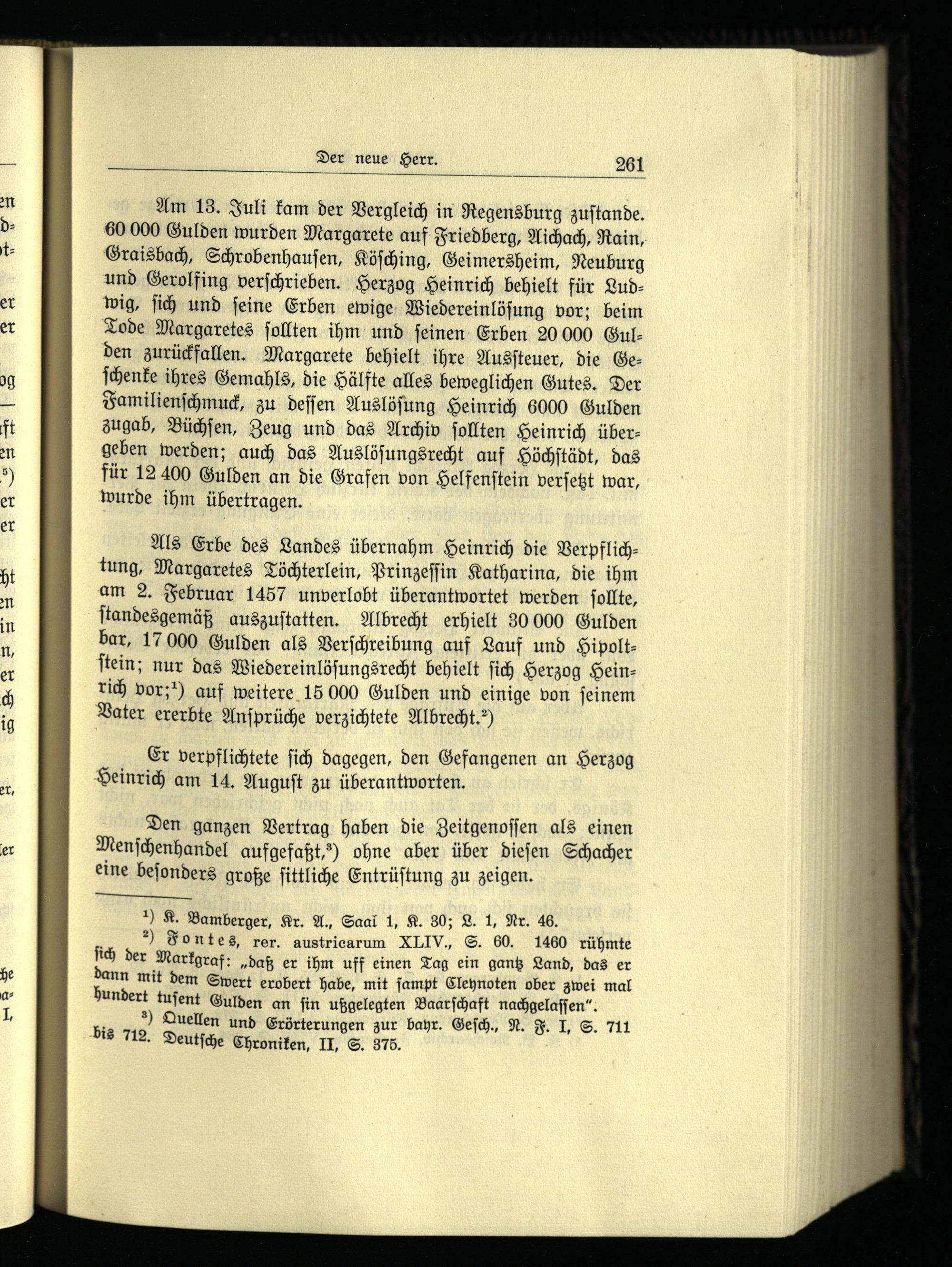 Am 13. Juli kam der Vergleich in Regensburg zuſtande. 60 000 Gulden wurden Margarete auf Friedberg , Aichach , Rain, Graisbach, Schrobenhauſen , Köſching , Geimersheim, Neuburg und Gerolfing verſchrieben. Herzog Heinrich behielt für Ludwig, ſich und ſeine Erben ewige Wiedereinlöſung vor; beim Tode Margaretes ſollten ihm und ſeinen Erben 20 000 Gulden zurückfallen. Margarete behielt ihre Ausſteuer, die Geſchenke ihres Gemahls, die Hälfte alles beweglichen Gutes. Der Familienſchmuck, zu deſſen Auslöſung Heinrich 6000 Gulden zugab, Büchſen, Zeug und das Archiv ſollten Heinrich übergeben werden; auch das Auslöſungsrecht auf Höchſtädt , das für 12 400 Gulden an die Grafen von Helfenſtein verſetzt war, wurde ihm übertragen.