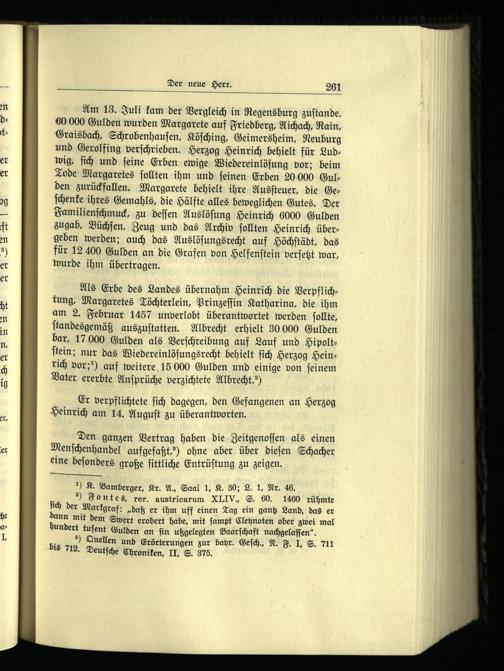 ) Fontes, rer. austricarum XLIV., S. 60. 1460 rühmte ſich der Markgraf:„daß er ihm uff einen Tag ein gantz Land, das er dann mit dem Swert erobert habe, mit ſampt Cleynoten ober zwei mal hundert tuſent Gulden an fin ußgelegten Baarſchaft nachgelaſſen“.