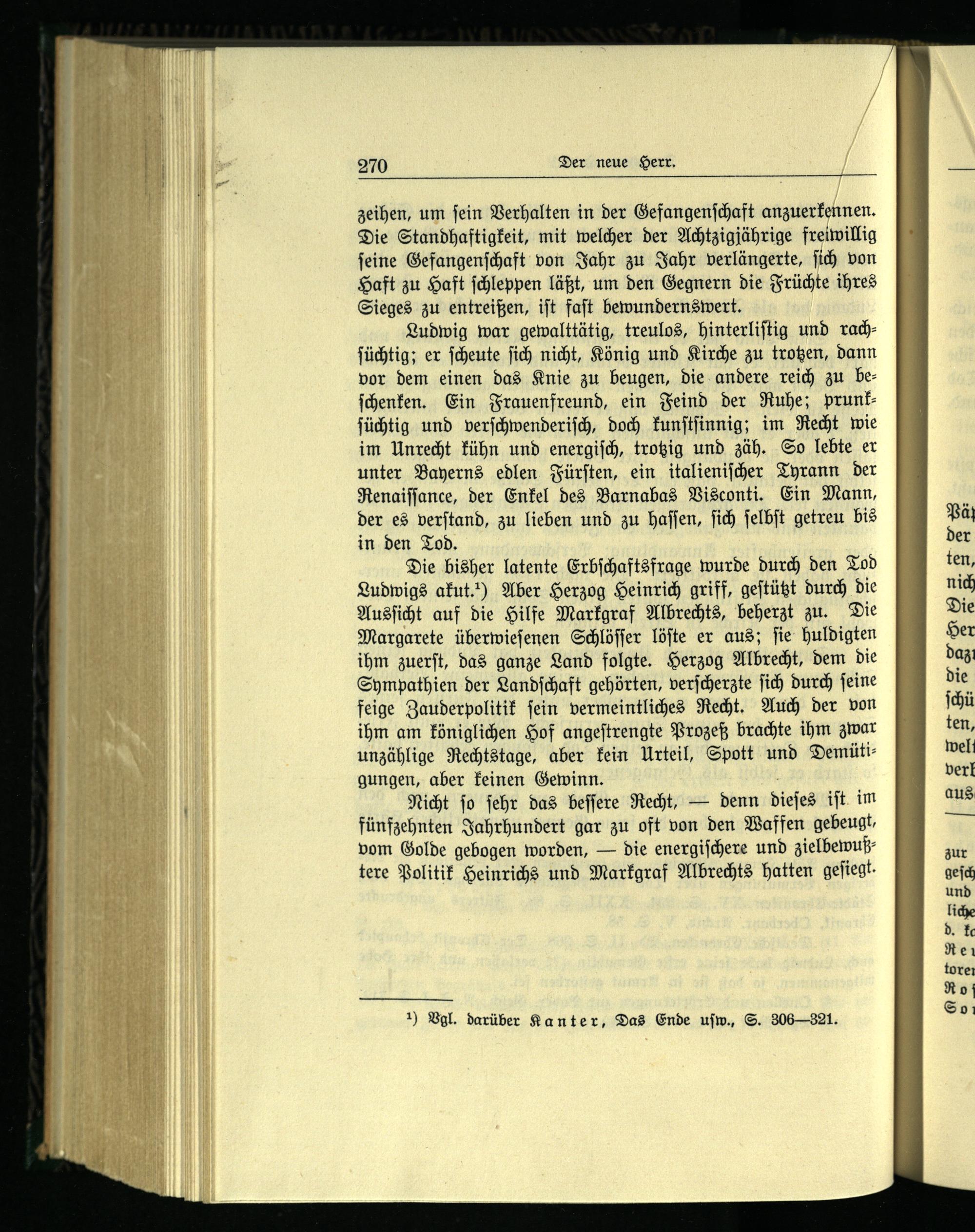 Ludwig war gewalttätig, treulos, hinterliſtig und rachſüchtig; er ſcheute ſich nicht, König und Kirche zu trotzen, dann vor dem einen das Knie zu beugen, die andere reich zu beſchenken. Ein Frauenfreund, ein Feind der Ruhe; prunkſüchtig und verſchwenderiſch, doch kunſtſinnig; im Recht wie im Unrecht kühn und energiſch, trotzig und zäh. So lebte er unter Bayerns edlen Fürſten, ein italieniſcher Tyrann der Renaiſſance, der Enkel des Barnabas Visconti. Ein Mann, der es verſtand, zu lieben und zu haſſen, ſich ſelbſt getreu bis in den Tod.