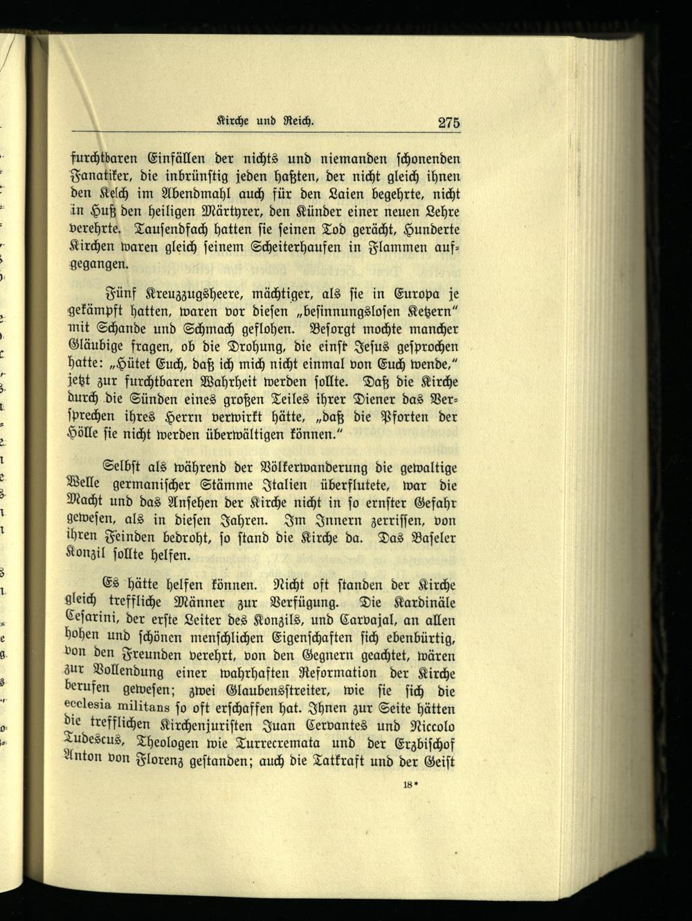 Es hätte helfen können. Nicht oft ſtanden der Kirche gleich treffliche Männer zur Verfügung. Die Kardinäle Ceſarini, der erſte Leiter des Konzils, und Carvajal, an allen hohen und ſchönen menſchlichen Eigenſchaften ſich ebenbürtig, von den Freunden verehrt, von den Gegnern geachtet, wären zur Vollendung einer wahrhaften Reformation der Kirche berufen geweſen; zwei Glaubensſtreiter, wie ſie ſich die ecclesia militans ſo oft erſchaffen hat. Ihnen zur Seite hätten die trefflichen Kirchenjuriſten Juan Cervantes und Niccolo Tudescus, Theologen wie Turrecremata und der Erzbiſchof Anton von Florenz geſtanden; auch die Tatkraft und der Geiſt