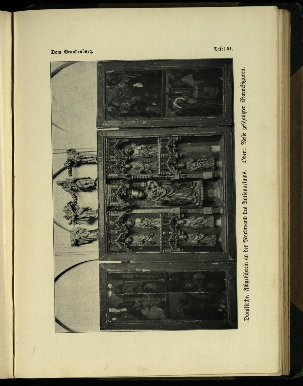 Dom Brandenburg. Tafel 51. Domkirche. Flügelschrein an der Nordwand des Antiquariums. Oben: Reste geschnigter Barockfiguren.