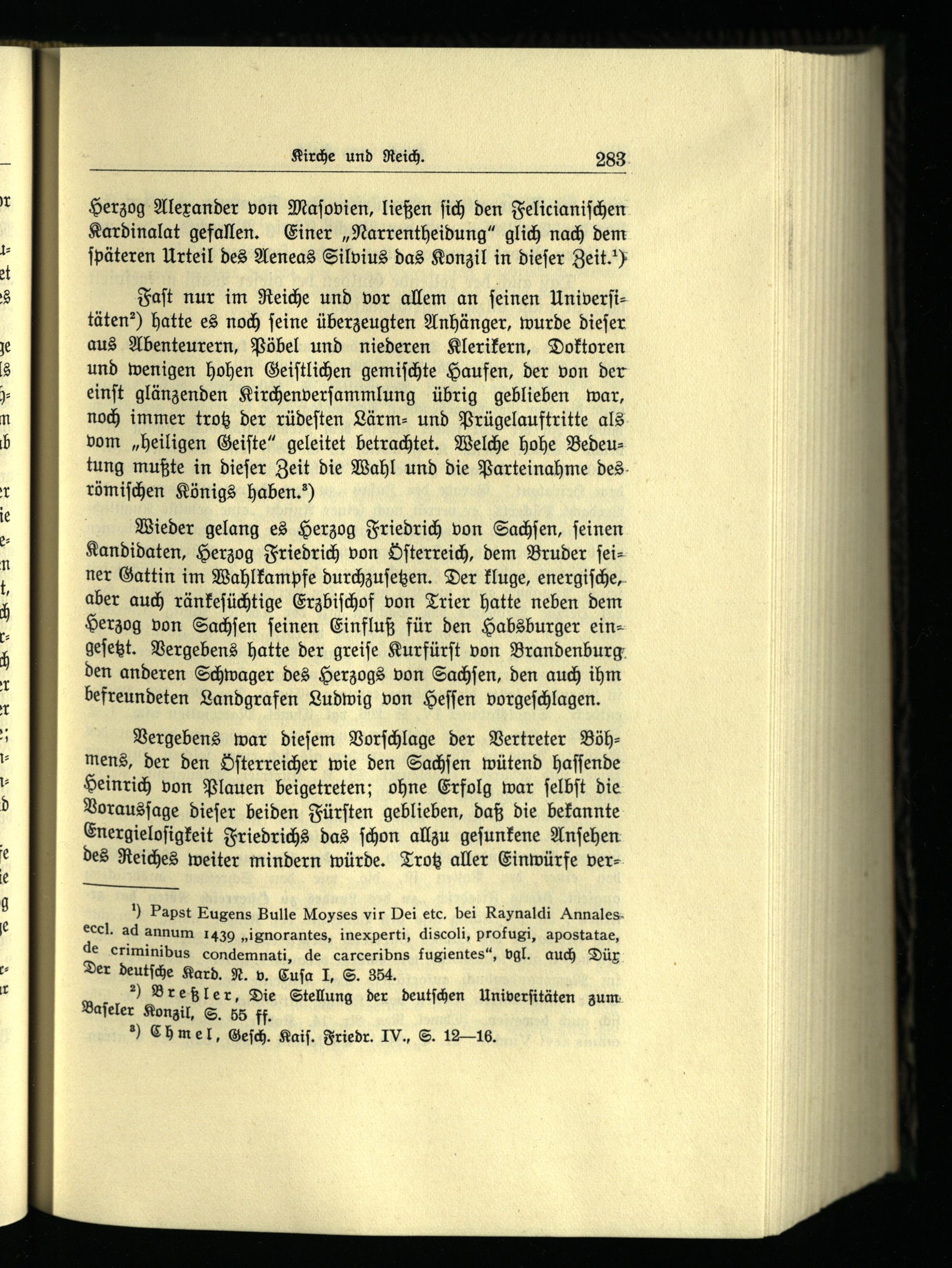 Faſt nur im Reiche und vor allem an ſeinen Univerſitäten?) hatte es noch ſeine überzeugten Anhänger, wurde dieſer aus Abenteurern, Pöbel und niederen Klerikern, Doktoren und wenigen hohen Geiſtlichen gemiſchte Haufen, der von der einſt glänzenden Kirchenverſammlung übrig geblieben war, noch immer trotz der rüdeſten Lärm- und Prügelauftritte als vom„heiligen Geiſte“ geleitet betrachtet. Welche hohe Bedeutung mußte in dieſer Zeit die Wahl und die Parteinahme des römiſchen Königs haben.“)