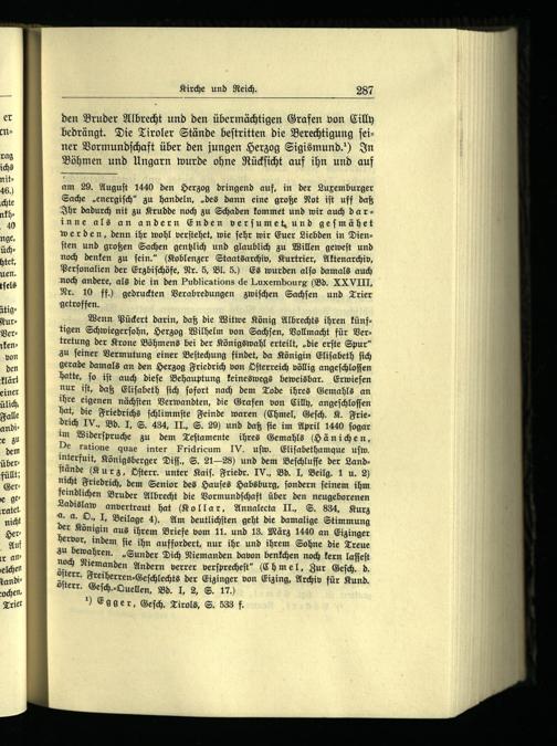 Wenn Pückert darin, daß die Witwe König Albrechts ihren künftigen Schwiegerſohn, Herzog Wilhelm von Sachſen, Vollmacht für Vertretung der Krone Böhmens bei der Königswahl erteilt,„die erſte Spur“ zu ſeiner Vermutung einer Beſtechung findet, da Königin Eliſabeth ſich gerade damals an den Herzog Friedrich von Hſterreich völlig angeſchloſſen hatte, ſo iſt auch dieſe Behauptung keineswegs beweisbar. Erwieſen nur iſt, daß Eliſabeth ſich ſofort nach dem Tode ihres Gemahls an ihre eigenen nächſten Verwandten, die Grafen von Cilly, angeſchloſſen hat, die Friedrichs ſchlimmſte Feinde waren(Chmel, Geſch. K. Friedrich IV., Bd. I, S. 434, II., S. 29) und daß fie im April 1440 ſogar im Widerſpruche zu dem Teſtamente ihres Gemahls(Hänichen, De ratione quae inter Fridricum IV. uſw. Eliſabethamque uſw. interfuit, Königsberger Diſſ., S. 21—28) und dem Beſchluſſe der Landſtände(Kurz, Hſterr. unter Kaiſ. Friedr. IV., Bd. I. Beilg. 1 u. 2) nicht Friedrich, dem Senior des Hauſes Habsburg , ſondern ſeinem ihm feindlichen Bruder Albrecht die Vormundſchaft über den neugeborenen Ladislaw anvertraut hat(Kollar, Annalecta II., S. 834, Kurz a. a. O. J, Beilage 4). Am deutlichſten geht die damalige Stimmung der Königin aus ihrem Briefe vom 11. und 13. März 1440 an Eizinger hervor, indem ſie ihn auffordert, nur ihr und ihrem Sohne die Treue Zu bewahren.„Sunder Dich Niemanden davon benkchen noch kern laſſeſt noch Niemanden Andern verrer verſprecheſt“(Chmel, Zur Geſch. d. oſterr. Freiherren⸗Geſchlechts der Eizinger von Eizing, Archiv für Kund. öſterr. Geſch. Quellen, Bd. I, 2, S. 17.)