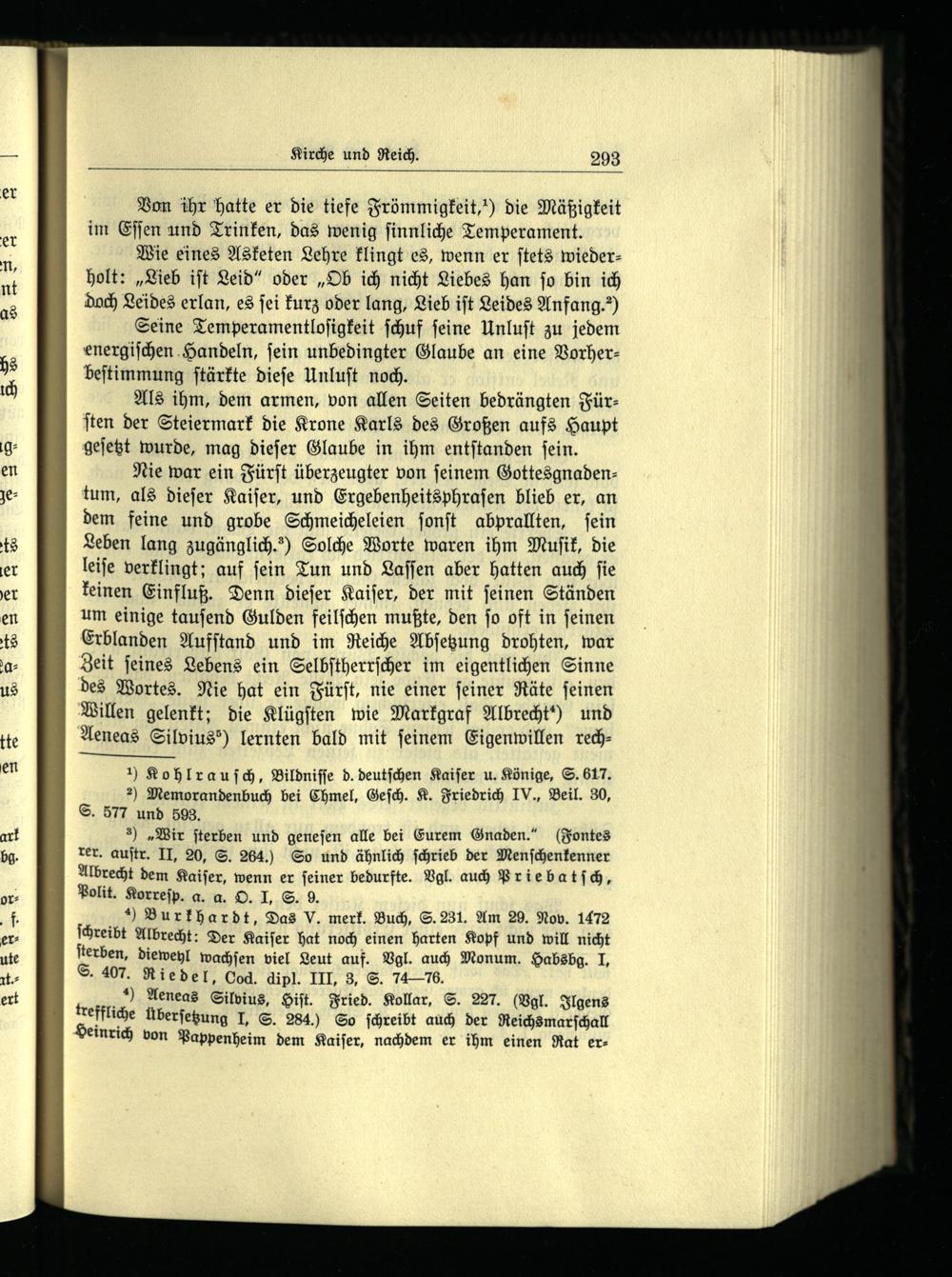 Nie war ein Fürſt überzeugter von ſeinem Gottesgnadentum, als dieſer Kaiſer, und Ergebenheitsphraſen blieb er, an dem feine und grobe Schmeicheleien ſonſt abprallten, ſein Leben lang zugänglich.?) Solche Worte waren ihm Muſik, die leiſe verklingt; auf ſein Tun und Laſſen aber hatten auch ſie keinen Einfluß. Denn dieſer Kaiſer, der mit ſeinen Ständen um einige tauſend Gulden feilſchen mußte, den ſo oft in ſeinen Erblanden Aufſtand und im Reiche Abſetzung drohten, war Zeit ſeines Lebens ein Selbſtherrſcher im eigentlichen Sinne des Wortes. Nie hat ein Fürſt, nie einer ſeiner Räte ſeinen Willen gelenkt; die Klügſten wie Markgraf Albrecht“) und Aeneas Silvius) lernten bald mit feinem Eigenwillen rech