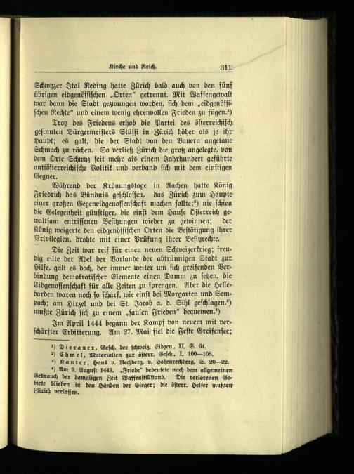 ) Am 9. Auguſt 1443.„Friede“ bedeutete nach dem allgemeinen Gebrauch der damaligen Zeit Waffenſtillſtand. Die verlorenen Gebiete blieben in den Händen der Sieger; die öſterr. Helfer mußten Zürich verlaſſen.