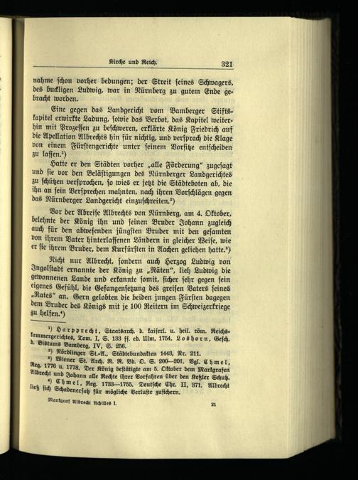 Eine gegen das Landgericht vom Bamberger Stiftskapitel erwirkte Ladung, ſowie das Verbot, das Kapitel weiterhin mit Prozeſſen zu beſchweren, erklärte König Friedrich auf die Apellation Albrechts hin für nichtig, und verſprach die Klage von einem Fürſtengerichte unter ſeinem Vorſitze entſcheiden zu laſſen.“)