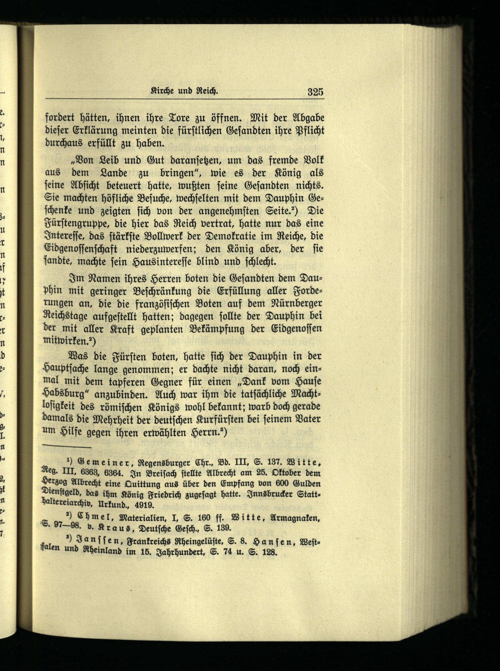 „Von Leib und Gut daranſetzen, um das fremde Volk aus dem Lande zu bringen“, wie es der König als ſeine Abſicht beteuert hatte, wußten ſeine Geſandten nichts. Sie machten höfliche Beſuche, wechſelten mit dem Dauphin Geſchenke und zeigten ſich von der angenehmſten Seite.“) Die Fürſtengruppe, die hier das Reich vertrat, hatte nur das eine Intereſſe, das ſtärkſte Bollwerk der Demokratie im Reiche, die Eidgenoſſenſchaft niederzuwerfen; den König aber, der ſie ſandte, machte ſein Hausintereſſe blind und ſchlecht.