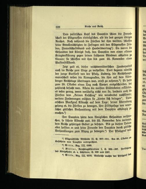 Dem politiſchen Kopf des Dauphin ſchien die Freundſchaft der Eidgenoſſen einträglicher, als die des ganzen übrigen Reiches. Noch während die Fürſten bei ihm weilten, ſchloſſen ſeine Bevollmächtigten in Zofingen mit den Eidgenoſſen Frieden, Freundſchaftsbund und Handelsvertrag!) So waren die Geſandten des Königs froh, den Dauphin von einer offenen Kriegserklärung gegen ſeinen früheren Bündner abhalten zu können; ſie ſchloſſen mit ihm bis zum 22. November einen Waffenſtillſtand.