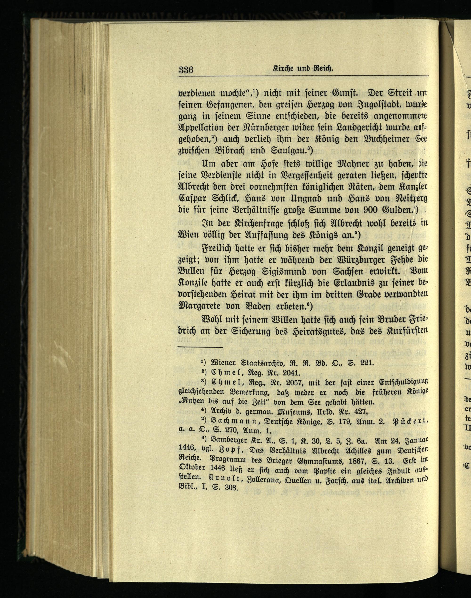 e) Bamberger Kr. A., S. 1, K. 30, L. 5, Z. 6a. Am 24. Januar 1446, vgl. Zopf, Das Verhältnis Albrecht Achilles zum Deutſchen Reiche. Programm des Brieger Gymnaſiums, 1867, S. 13. Erſt im Oktober 1446 ließ er ſich auch vom Papſte ein gleiches Indult auf