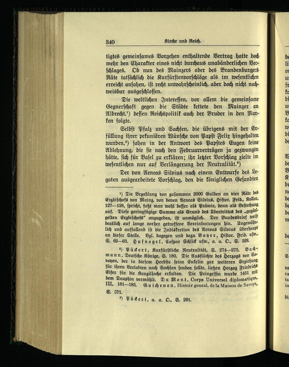 2) Pückert, Kurfürſtliche Neutralität, S. 274275. Bad“ mann, Deutſche Könige, S. 180. Die Ausflüchte des Herzogs von Gavohen, der in dieſem Herbſte feine Enkelin zur weiteren Erziehung für ihren Verlobten nach Sachſen ſenden ſollte, ließen Herzog Friedrich Eifer für die Konzilſache erkalten. Die Prinzeſſin wurde 1451 mit dem Dauphin vermählt. Du Mont, Corps Universel diplomatique, III, 181188. Gui chenon, Histoir geneal. de la Maison de Savoy“ S. 371.