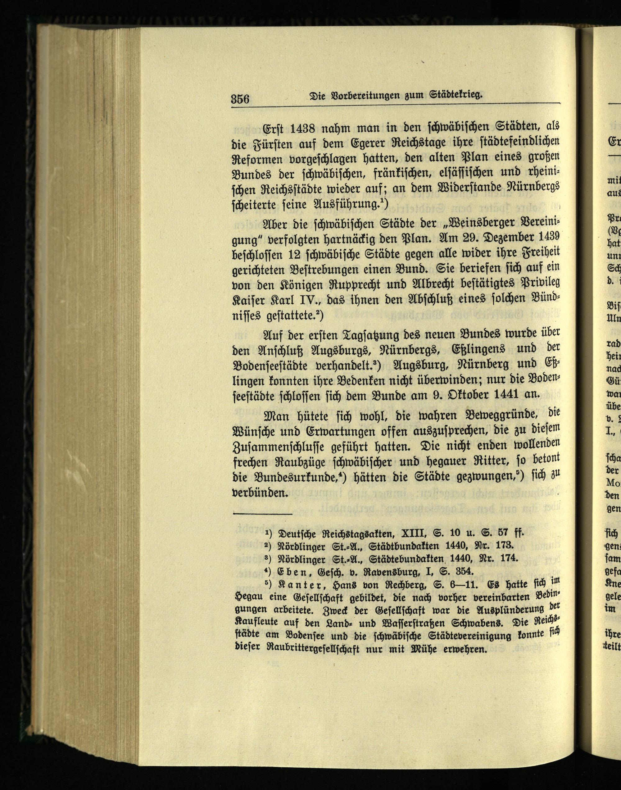 Erſt 1438 nahm man in den ſchwäbiſchen Städten, als die Fürſten auf dem Egerer Reichstage ihre ſtädtefeindlichen Reformen vorgeſchlagen hatten, den alten Plan eines großen Bundes der ſchwäbiſchen, fränkiſchen, elſäſſiſchen und rheiniſchen Reichsſtädte wieder auf; an dem Widerſtande Nürnbergs ſcheiterte ſeine Ausführung.“)|