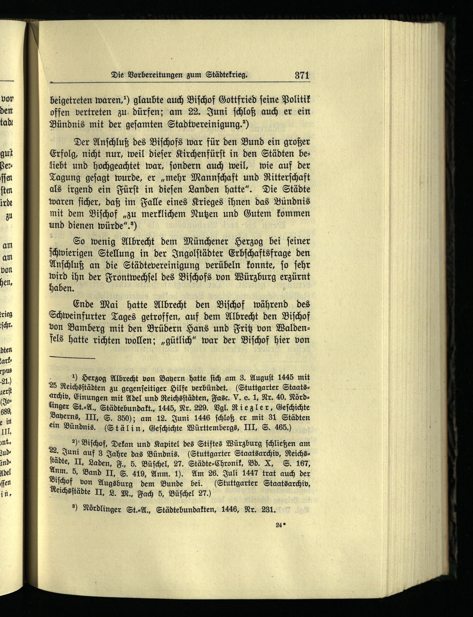 ; 1) Herzog Albrecht von Bayern hatte ſich am 3. Auguſt 1445 mit 25 Reichsſtädten zu gegenſeitiger Hilfe verbündet.(Stuttgarter Staatsarchiv, Einungen mit Adel und Reichsſtädten, Fasc. V. C. 1, Nr. 40. Nörd linger St.⸗A., Städtebundakt., 1445, Nr. 229. Vgl. Riez ler, Geſchichte Bayerns , III, S. 350); am 12. Juni 1446 ſchloß er mit 31 Städten ein Bündnis.(Stälin, Geſchichte Württembergs, III, S. 465.)