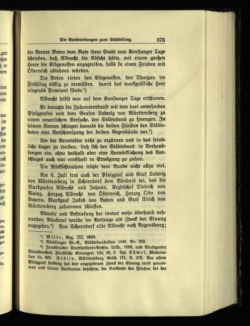Er benutzte die Zuſammenkunft mit dem dort anweſenden Pfalzgrafen und dem Grafen Ludwig von Württemberg zu einem neuerlichem Verſuche, den Städtebund zu ſprengen. In ſeinem Namen ſchlugen damals die beiden Fürſten den Städteboten eine Verſchmelzung der beiden Gegenbünde vor.“)