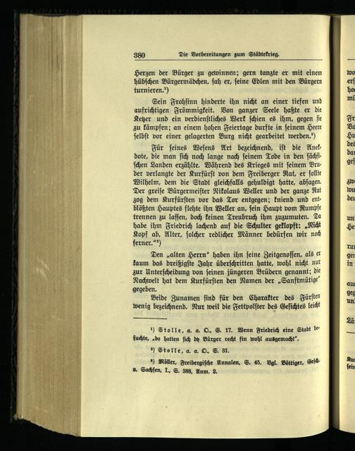 Für feines Weſens Art bezeichnend, iſt die Anekdote, die man ſich noch lange nach ſeinem Tode in den ſächſiſchen Landen erzählte. Während des Krieges mit feinem Bruder verlangte der Kurfürſt von dem Freiberger Rat, er ſollte Wilhelm, dem die Stadt gleichfalls gehuldigt hatte, abſagen. Der greiſe Bürgermeiſter Nikolaus Weller und der ganze Rat zog dem Kurfürſten vor das Tor entgegen; kniend und entblößten Hauptes flehte ihn Weller an, ſein Haupt vom Rumpfe trennen zu laſſen, doch keinen Treubruch ihm zuzumuten. Da