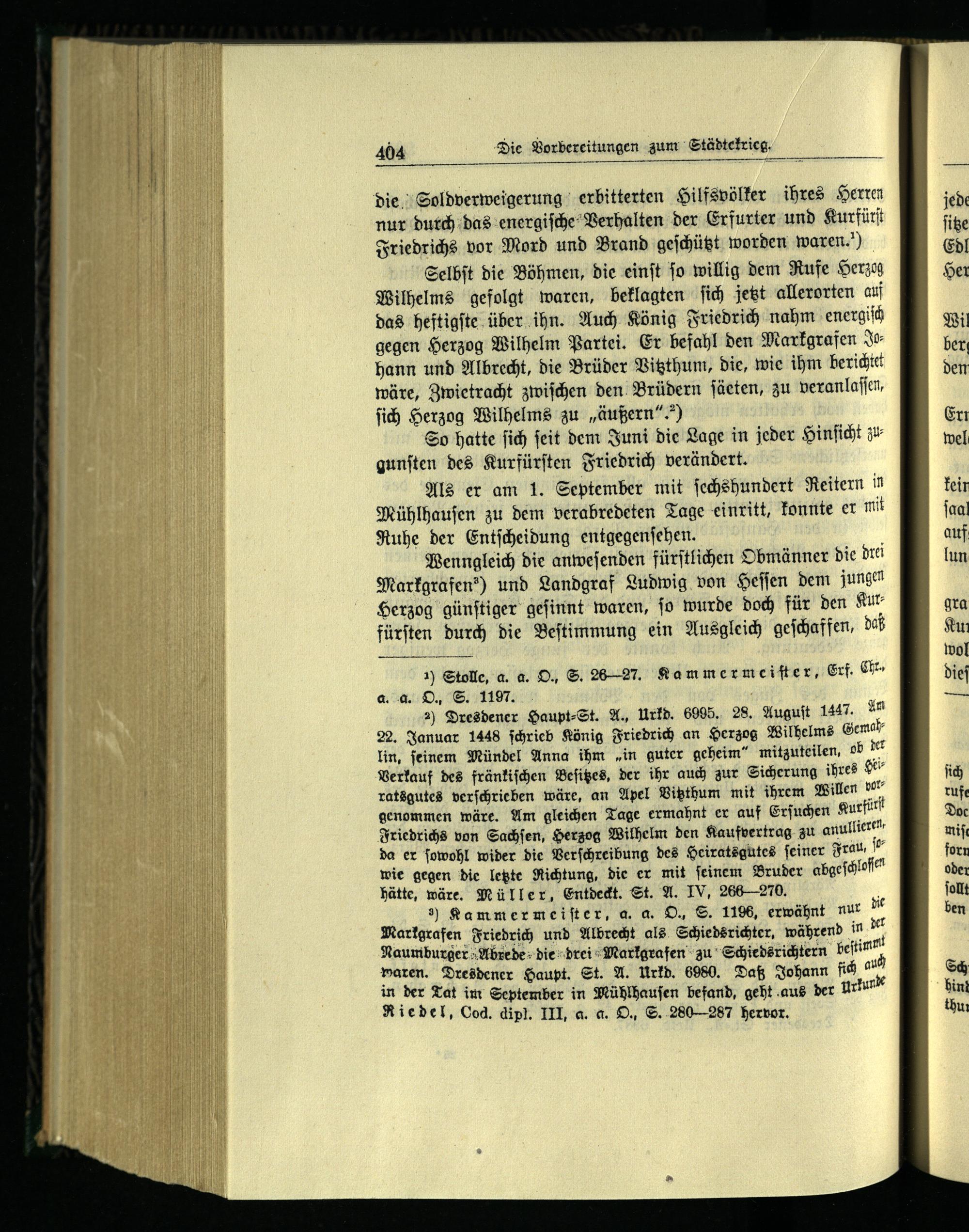 3) Kammermeiſter, a. a. O., S. 1196, erwähnt nur R Markgrafen Friedrich und Albrecht als Schiedsrichter, während in be Naumburger Abrede die drei Markgrafen zu Schiedsrichtern beſtim waren. Dresdener Haupt. St. A. Urkd. 6980. Daß Johann fich au in der Tat im September in Mühlhauſen befand, geht aus der Urkunde Riedel, Cod. dipl. III, a. a. O., S. 280—287 hervor.