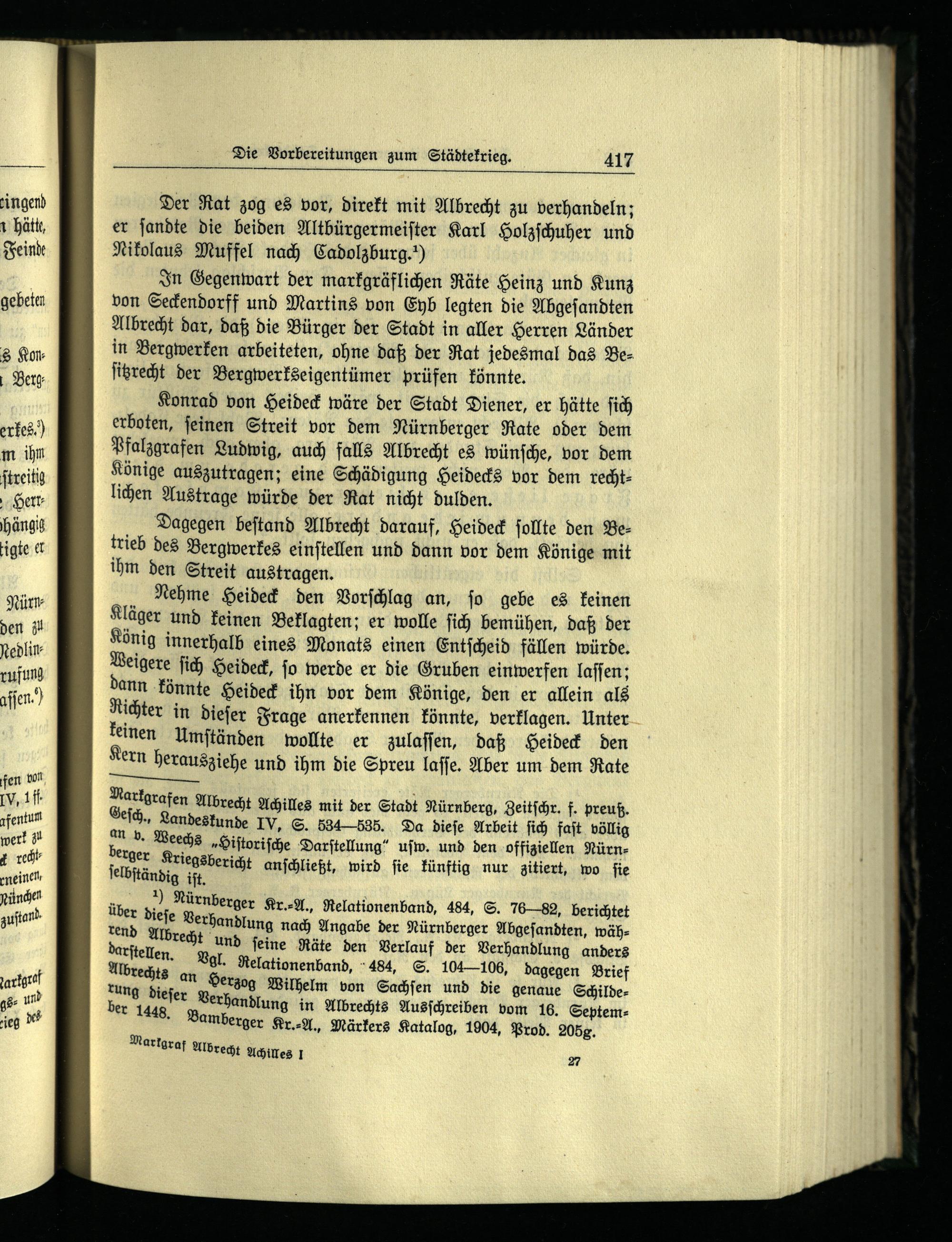 N Albrecht Achilles mit der Stadt Nürnberg , Zeitſchr. f. preuß. 3 1 SS nde IV. S. 534— 535. Da dieſe Arbeit ſich faſt völlig 1 Aae ere Darſtellung“ uſw. und den offiziellen Nürn