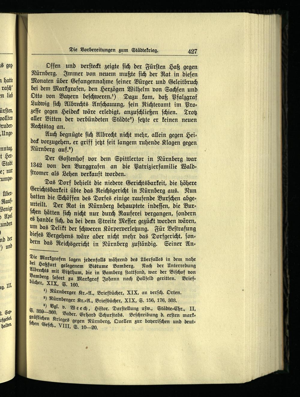 Auch begnügte ſich Albrecht nicht mehr, allein gegen Hei deck vorzugehen, er griff jetzt ſeit langem ruhende Klagen gegen Nürnberg auf.“)|