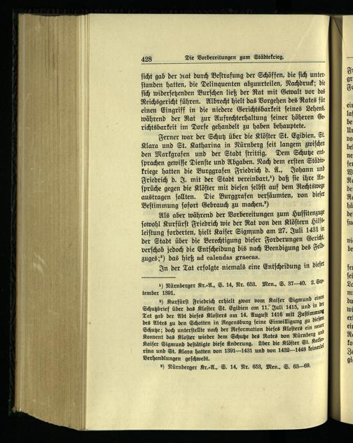 2) Kurfürſt Friedrich erhielt zwar vom Kaiſer Sigmund e Schutzbrief über das Kloſter St. Egidien am 11. Juli 1415, und in Tat gab der Abt dieſes Kloſters am 14. Auguſt 1416 mit Zuſtimmung des Abtes zu den Schotten in Regensburg ſeine Einwilligung zu dieſen Schutze; doch unterſtellte nach der Reformation dieſes Kloſters ein neut; Konvent das Kloſter wieder dem Schutze des Rates von Nürnberg un Kaiſer Sigmund beſtätigte dieſe Anderung. Über die Klöſter St. Kathe rina und St. Klara hatten von 13911431 und von 14321448 keinerle Verhandlungen geſchwebt.