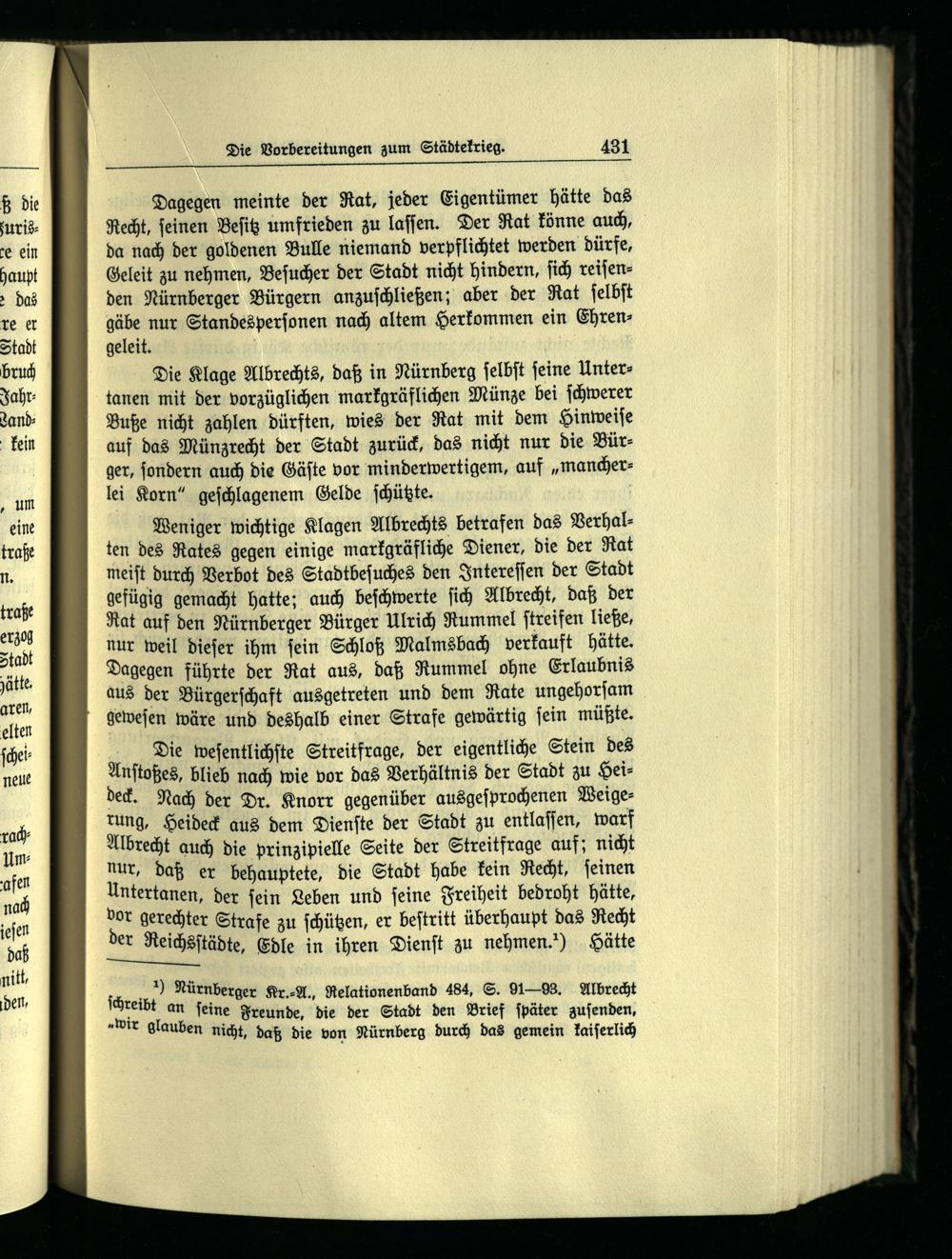 Weniger wichtige Klagen Albrechts betrafen das Verhalten des Rates gegen einige markgräfliche Diener, die der Rat meiſt durch Verbot des Stadtbeſuches den Intereſſen der Stadt gefügig gemacht hatte; auch beſchwerte ſich Albrecht, daß der Rat auf den Nürnberger Bürger Ulrich Rummel ſtreifen ließe, nur weil dieſer ihm ſein Schloß Malmsbach verkauft hätte. Dagegen führte der Rat aus, daß Rummel ohne Erlaubnis aus der Bürgerſchaft ausgetreten und dem Rate ungehorſam geweſen wäre und deshalb einer Strafe gewärtig ſein müßte.