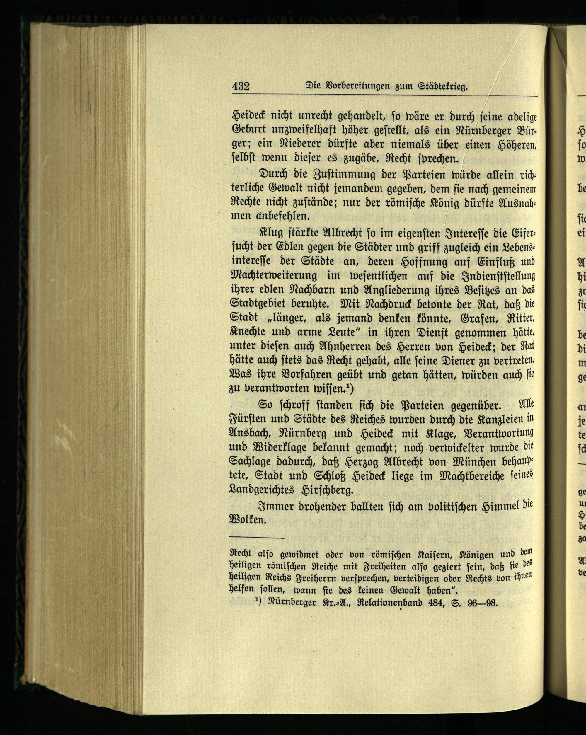 So ſchroff ſtanden ſich die Parteien gegenüber. Ale Fürſten und Städte des Reiches wurden durch die Kanzleien in Ansbach , Nürnberg und Heideck mit Klage, Verantwortung und Widerklage bekannt gemacht; noch verwickelter wurde die Sachlage dadurch, daß Herzog Albrecht von München behaup­tete, Stadt und Schloß Heideck liege im Machtbereiche feines Landgerichtes Hirſchberg. f