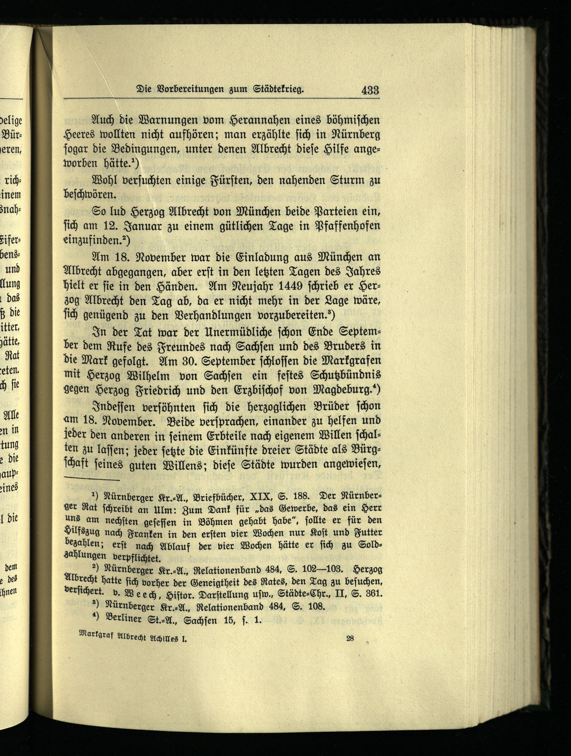 Auch die Warnungen vom Herannahen eines böhmiſchen Heeres wollten nicht aufhören; man erzählte ſich in Nürnberg ſogar die Bedingungen, unter denen Albrecht dieſe Hilfe angeworben hätte.“) 8