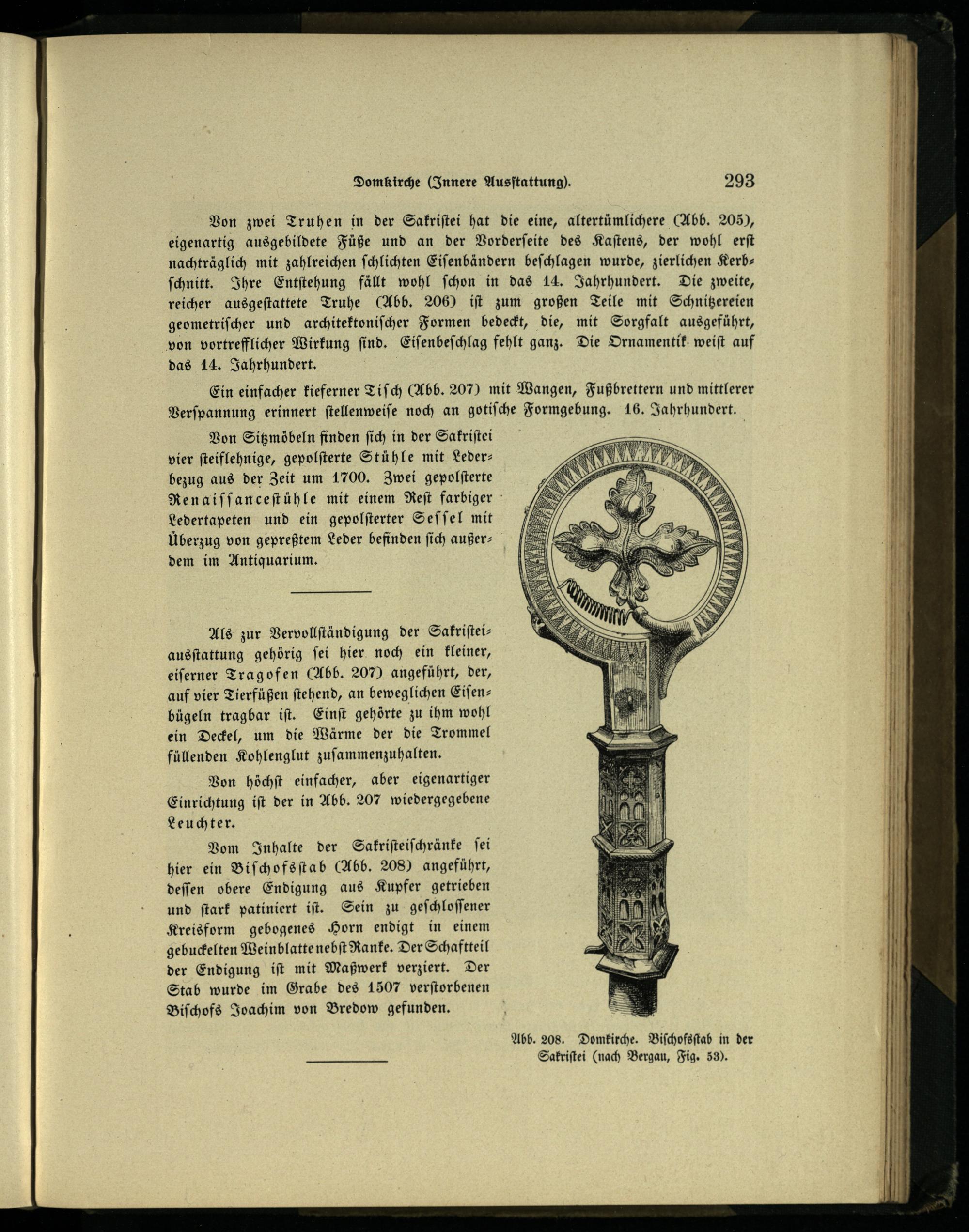 Vom Inhalte der Sakriſteiſchränke ſei hier ein Biſchofsſtab(Abb. 208) angeführt, deſſen obere Endigung aus Kupfer getrieben und ſtark patiniert iſt. Sein zu geſchloſſener Kreisform gebogenes Horn endigt in einem gebuckelten Weinblatte nebſt Ranke. Der Schaftteil der Endigung iſt mit Maßwerk verziert. Der Stab wurde im Grabe des 1507 verſtorbenen Biſchofs Joachim von Bredow gefunden.