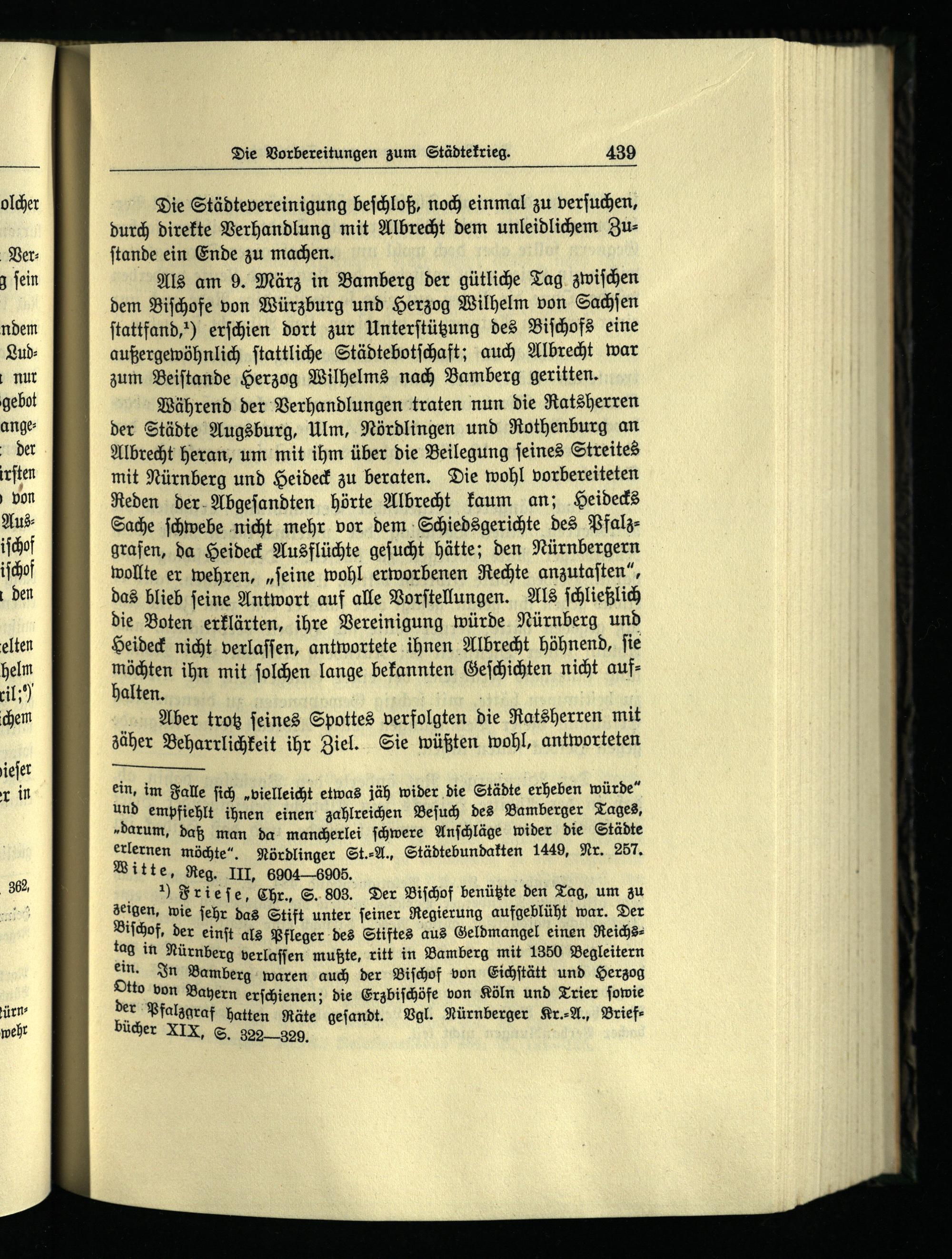 Als am 9. März in Bamberg der gütliche Tag zwiſchen dem Biſchofe von Würzburg und Herzog Wilhelm von Sachſen ſtattfand,) erſchien dort zur Unterſtützung des Biſchofs eine außergewöhnlich ſtattliche Städtebotſchaft; auch Albrecht war zum Beiſtande Herzog Wilhelms nach Bamberg geritten.