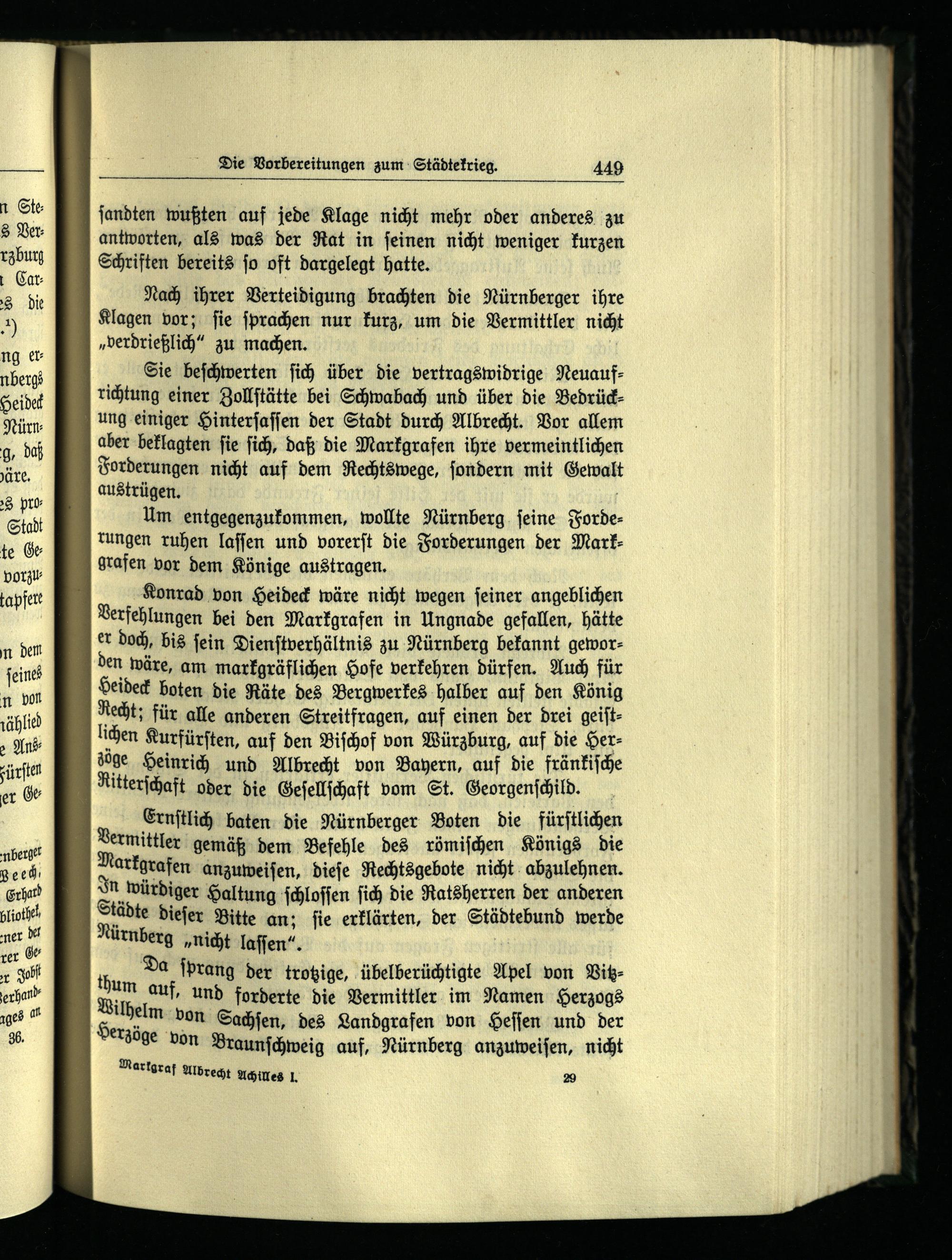 Vermittler gemäß dem Befehle des römiſchen Königs die Markgrafen anzuweiſen, dieſe Rechtsgebote nicht abzulehnen. In würdiger Haltung ſchloſſen ſich die Ratsherren der anderen Städte dieſer Bitte an; ſie erklärten, der Städtebund werde Nürnberg „nicht laſſen“. Da ſprang der trotzige, übelberüchtigte Apel von Vitzauf, und forderte die Vermittler im Namen Herzogs M von Sachſen, des Landgrafen von Heſſen und der ge von Braunſchweig auf, Nürnberg anzuweiſen, nicht Markgraf Albrecht Achilles l. 29