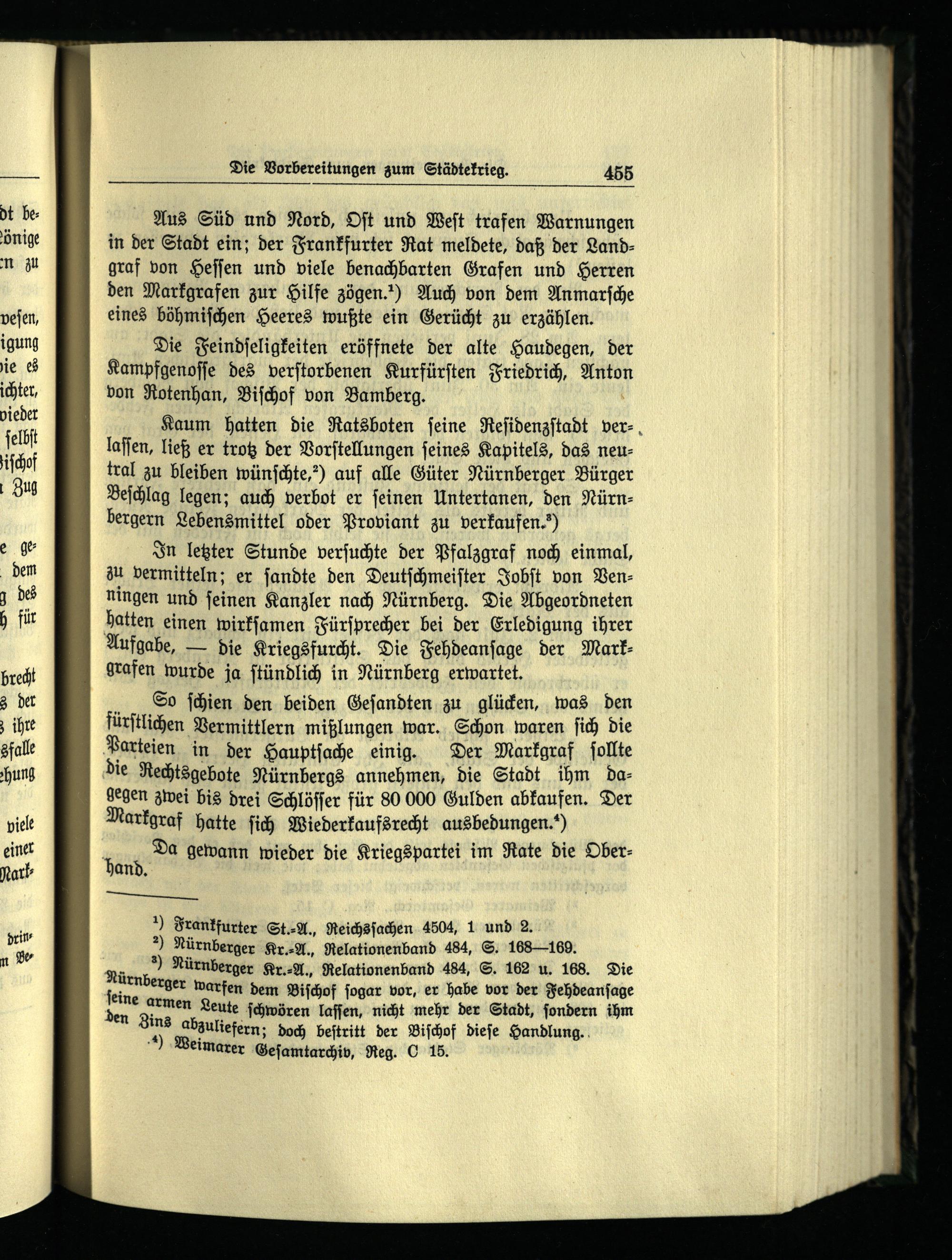 Kaum hatten die Ratsboten ſeine Reſidenzſtadt verlaſſen, ließ er trotz der Vorſtellungen ſeines Kapitels, das neutral zu bleiben wünſchte,) auf alle Güter Nürnberger Bürger Beſchlag legen; auch verbot er ſeinen Untertanen, den Nürnbergern Lebensmittel oder Proviant zu verkaufen.“)