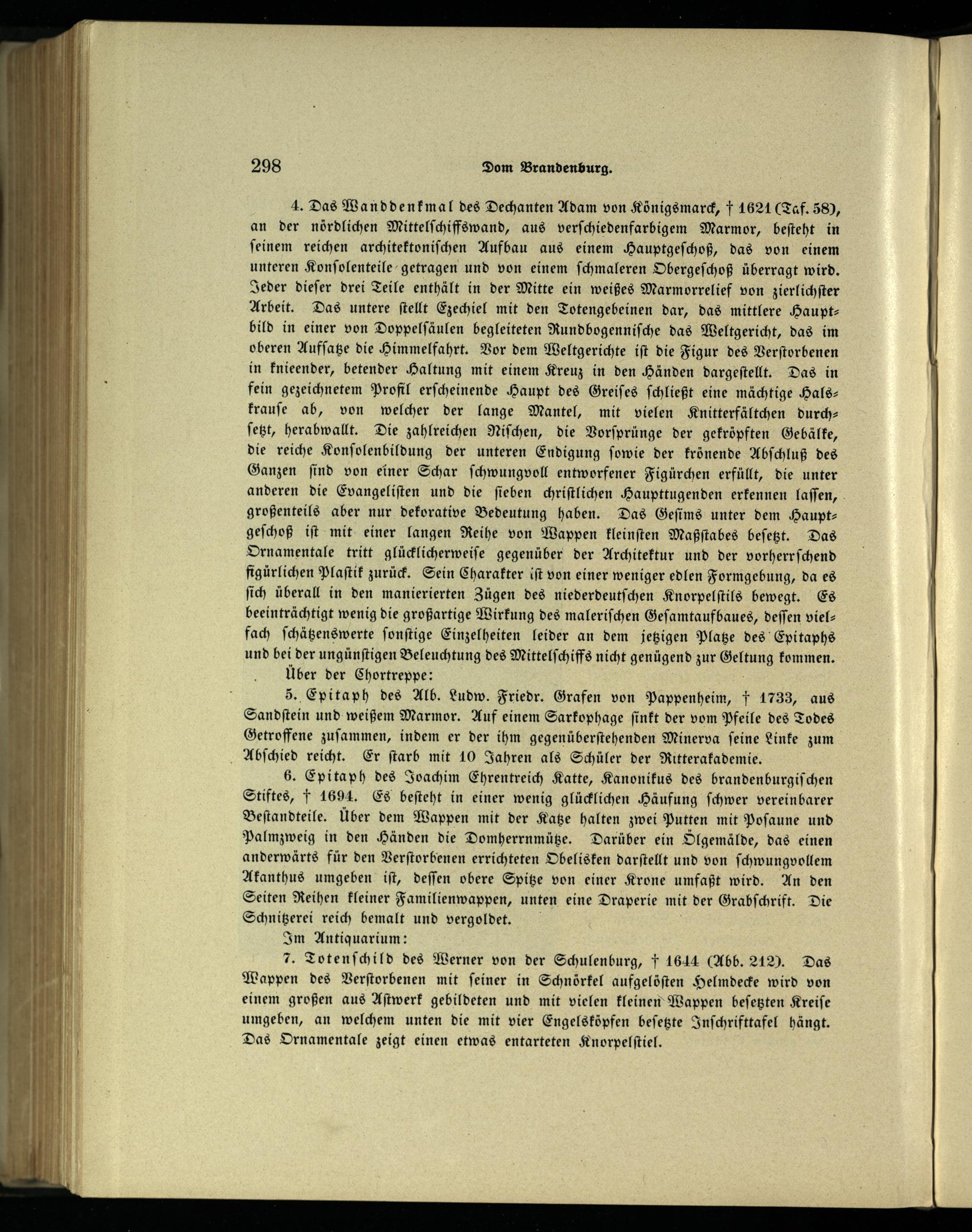 6. Epitaph des Joachim Ehrentreich Katte, Kanonikus des brandenburgiſchen Stiftes, F 1694. Es beſteht in einer wenig glücklichen Häufung ſchwer vereinbarer Beſtandteile. Über dem Wappen mit der Katze halten zwei Putten mit Poſaune und Palmzweig in den Händen die Domherrnmütze. Darüber ein Ölgemälde, das einen anderwärts für den Verſtorbenen errichteten Obelisken darſtellt und von ſchwungvollem Akanthus umgeben iſt, deſſen obere Spitze von einer Krone umfaßt wird. An den Seiten Reihen kleiner Familienwappen, unten eine Draperie mit der Grabſchrift. Die Schnitzerei reich bemalt und vergoldet.