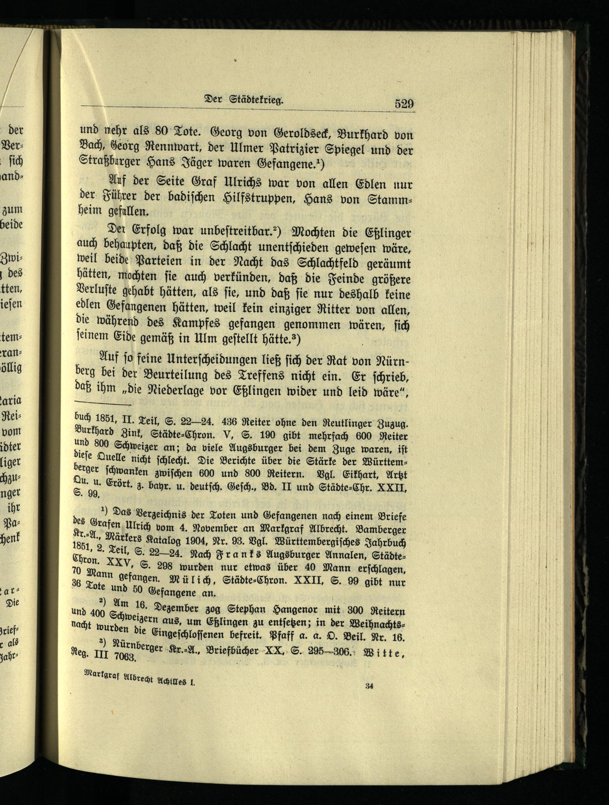 und mehr als 80 Tote. Georg von Geroldseck, Burkhard von Bach, Georg Rennwart, der Ulmer Patrizier Spiegel und der Straßburger Hans Jäger waren Gefangene.“) f f