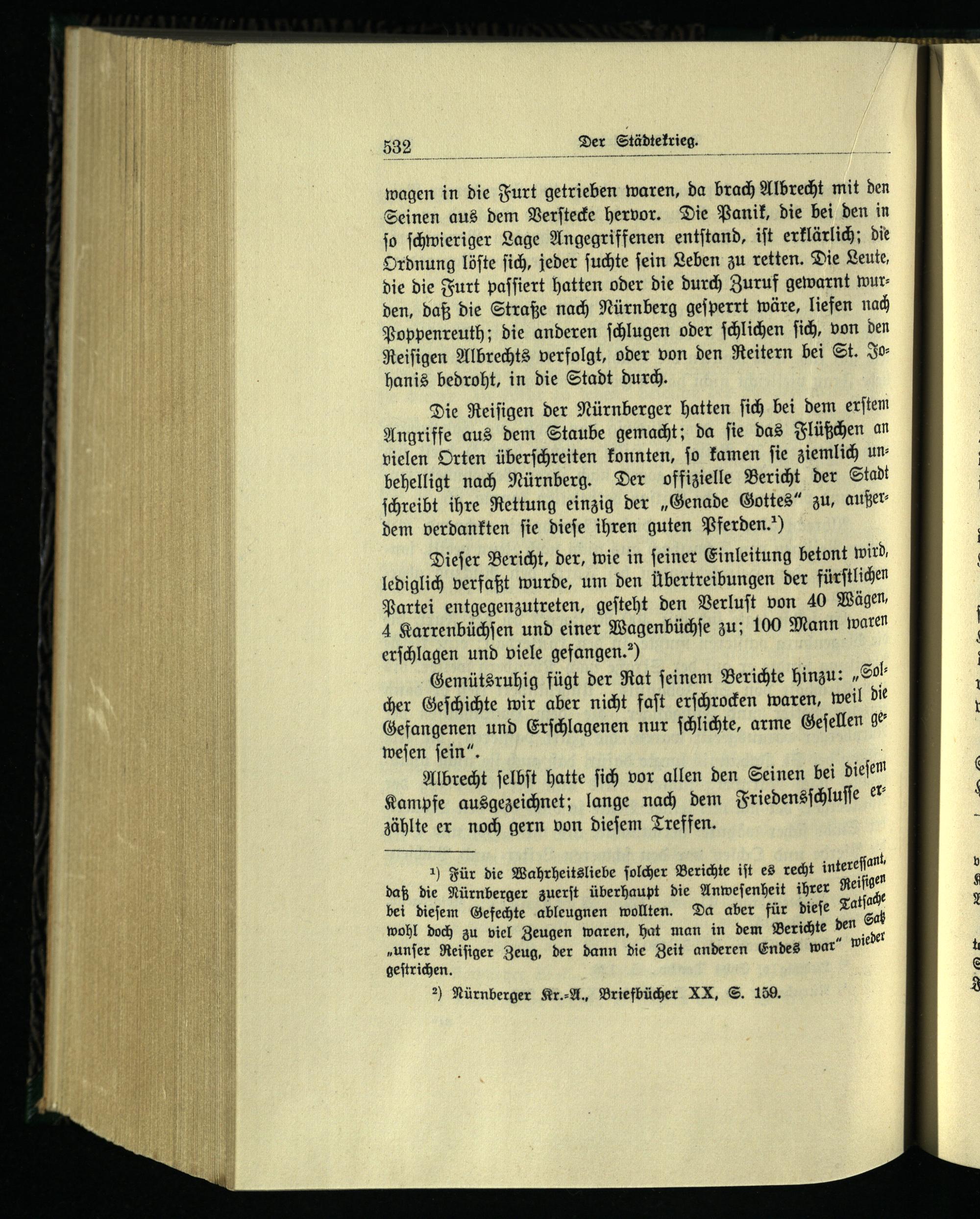 wagen in die Furt getrieben waren, da brach Albrecht mit den Seinen aus dem Verſtecke hervor. Die Panik, die bei den in ſo ſchwieriger Lage Angegriffenen entſtand, iſt erklärlich; die Ordnung löſte ſich, jeder ſuchte ſein Leben zu retten. Die Leute, die die Furt paſſiert hatten oder die durch Zuruf gewarnt wurden, daß die Straße nach Nürnberg geſperrt wäre, liefen nach Poppenreuth; die anderen ſchlugen oder ſchlichen ſich, von den Reiſigen Albrechts verfolgt, oder von den Reitern bei St. Johanis bedroht, in die Stadt durch.