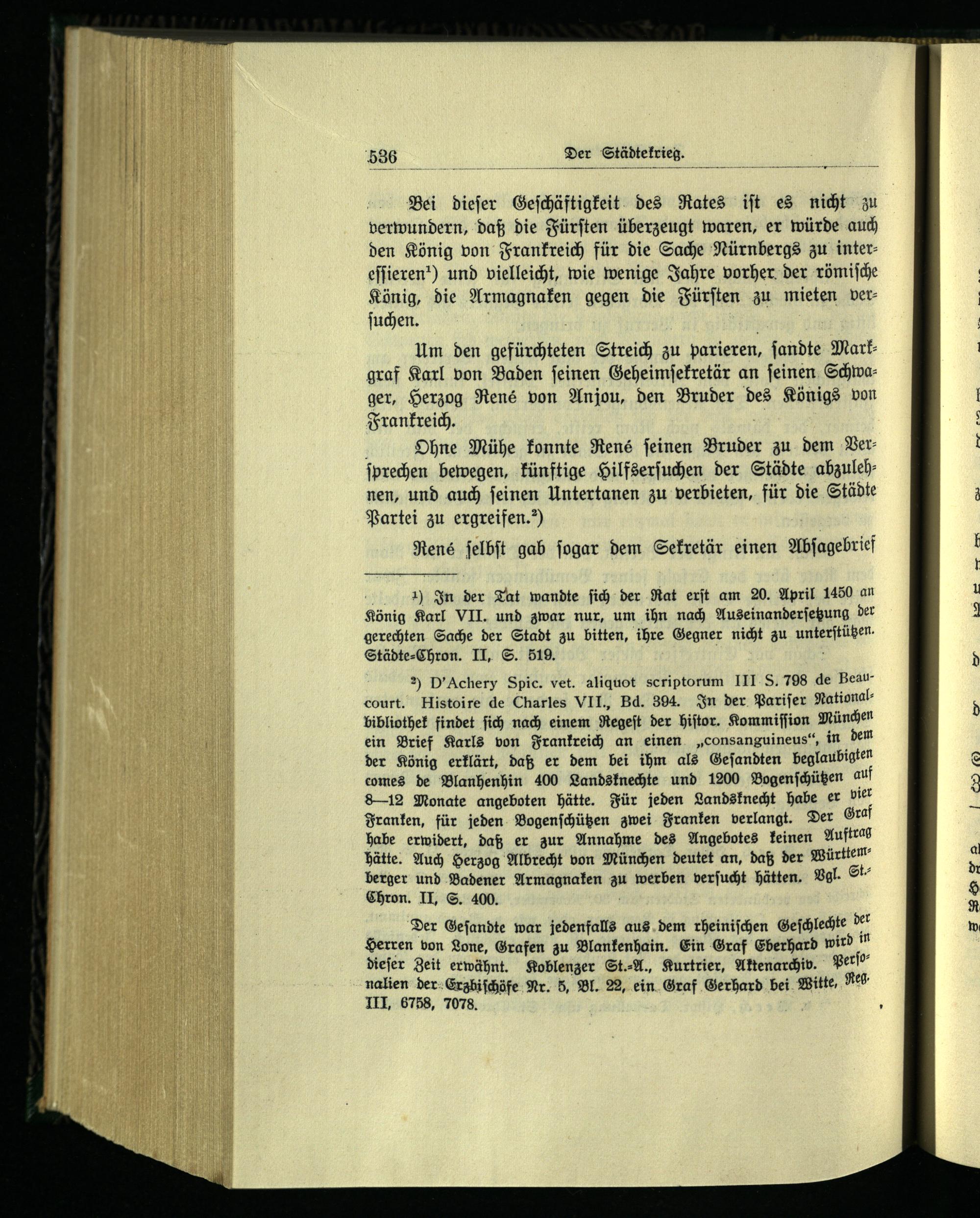 verwundern, daß die Fürſten überzeugt waren, er würde auch den König von Frankreich für die Sache Nürnbergs zu intereſſieren) und vielleicht, wie wenige Jahre vorher der römiſche König, die Armagnaken gegen die Fürſten zu mieten verſuchen.) Um den gefürchteten Streich zu parieren, ſandte Markgraf Karl von Baden ſeinen Geheimſekretär an ſeinen Schwager, Herzog René von Anjou , den Bruder des Königs von Frankreich . 5 Ohne Mühe konnte René feinen Bruder zu dem Verſprechen bewegen, künftige Hilfserſuchen der Städte abzulehnen, und auch ſeinen Untertanen zu verbieten, für die Städte Partei zu ergreifen.“)