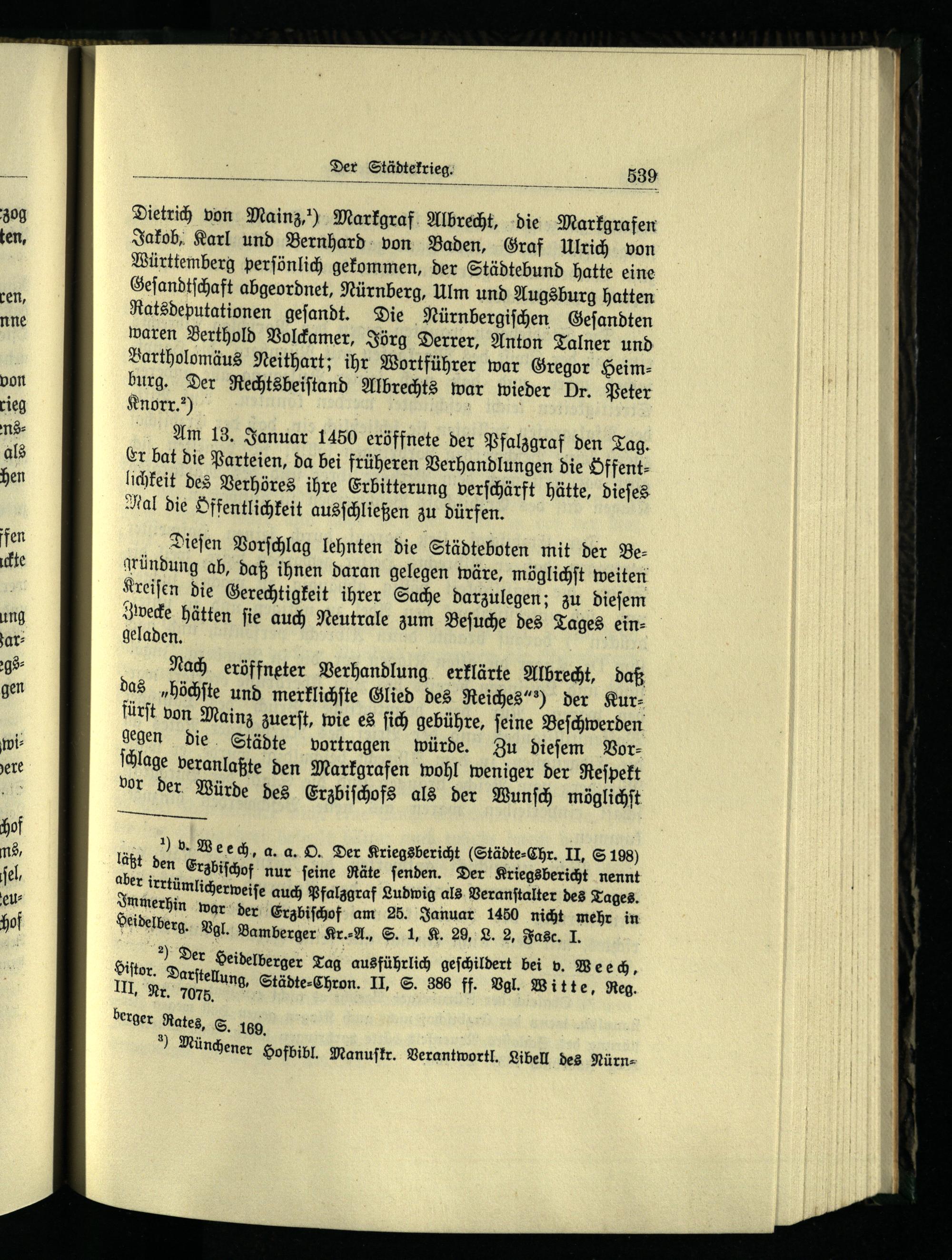 Dietrich von Mainz ,) Markgraf Albrecht, die Markgrafen Jakob, Karl und Bernhard von Baden, Graf Ulrich von Württemberg perſönlich gekommen, der Städtebund hatte eine Geſandtſchaft abgeordnet, Nürnberg , Ulm und Augsburg hatten Ratsdeputationen geſandt. Die Nürnbergiſchen Geſandten waren Berthold Volckamer, Jörg Derrer, Anton Talner und Bartholomäus Neithart; ihr Wortführer war Gregor Heimburg. Der Rechtsbeiſtand Albrechts war wieder Dr. Peter Knorr.) g.; Am 13. Januar 1450 eröffnete der Pfalzgraf den Tag. Er bat die Parteien, da bei früheren Verhandlungen die Öffentlichkeit des Verhöres ihre Erbitterung verſchärft hätte, dieſes Mal die Öffentlichkeit ausſchließen zu dürfen.