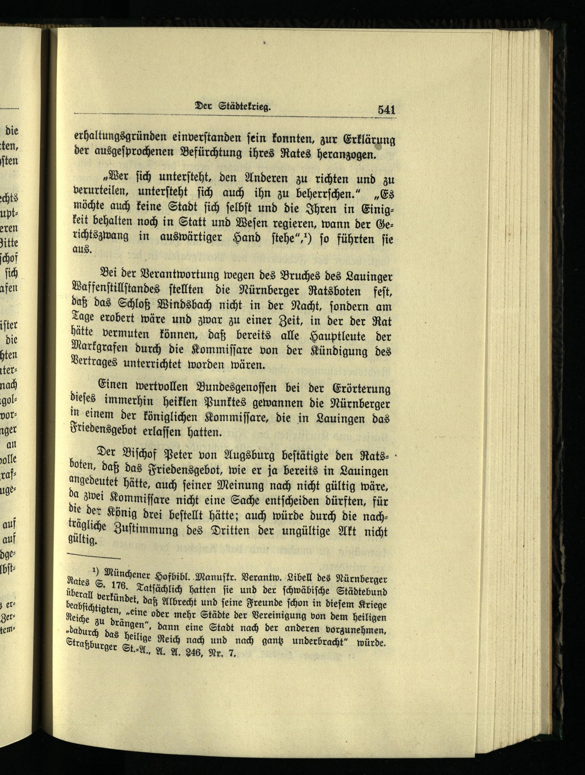 Bei der Verantwortung wegen des Bruches des Lauinger Waffenſtillſtandes ſtellten die Nürnberger Ratsboten feſt, daß das Schloß Windsbach nicht in der Nacht, ſondern am Tage erobert wäre und zwar zu einer Zeit, in der der Rat hätte vermuten können, daß bereits alle Hauptleute der Markgrafen durch die Kommiſſare von der Kündigung des Vertrages unterrichtet worden wären.